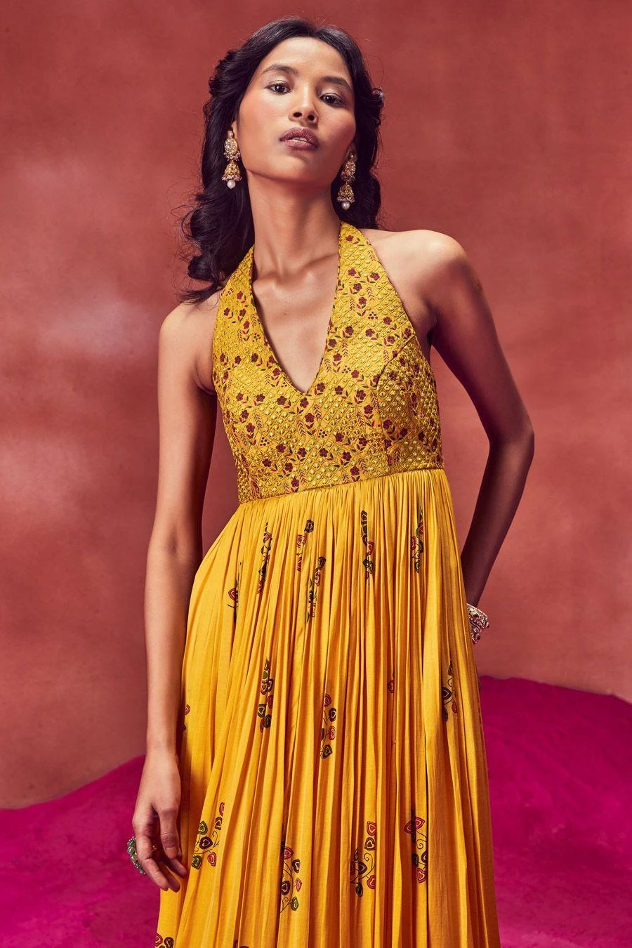 Look effortlessly stylish with this yellow dress for this upcoming wedding season. Crafted in satin silk, this dress features a halter neck with resham & patra embellished yoke. Add a pair of statement earrings to complete the look.