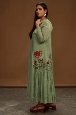 This one of a kind printed shirt dress is set in pure silk. It has a draped waist & a shirt collar & cuff. This colour blocked piece can be worn as is or be styled with the matching trousers. This piece is perfect for daytime events.