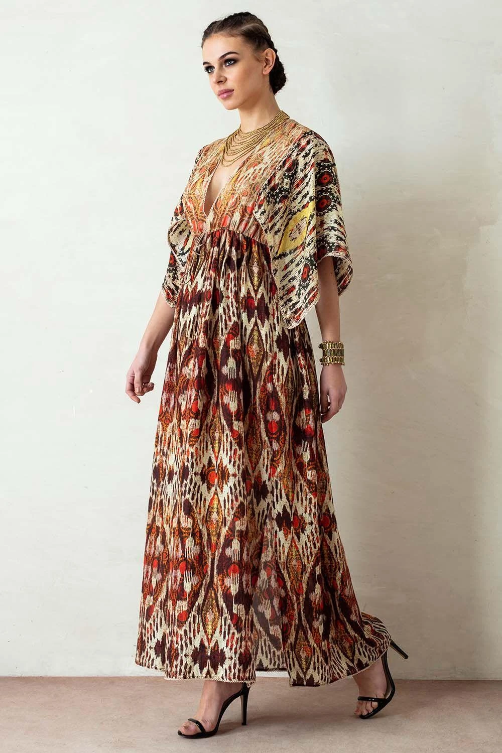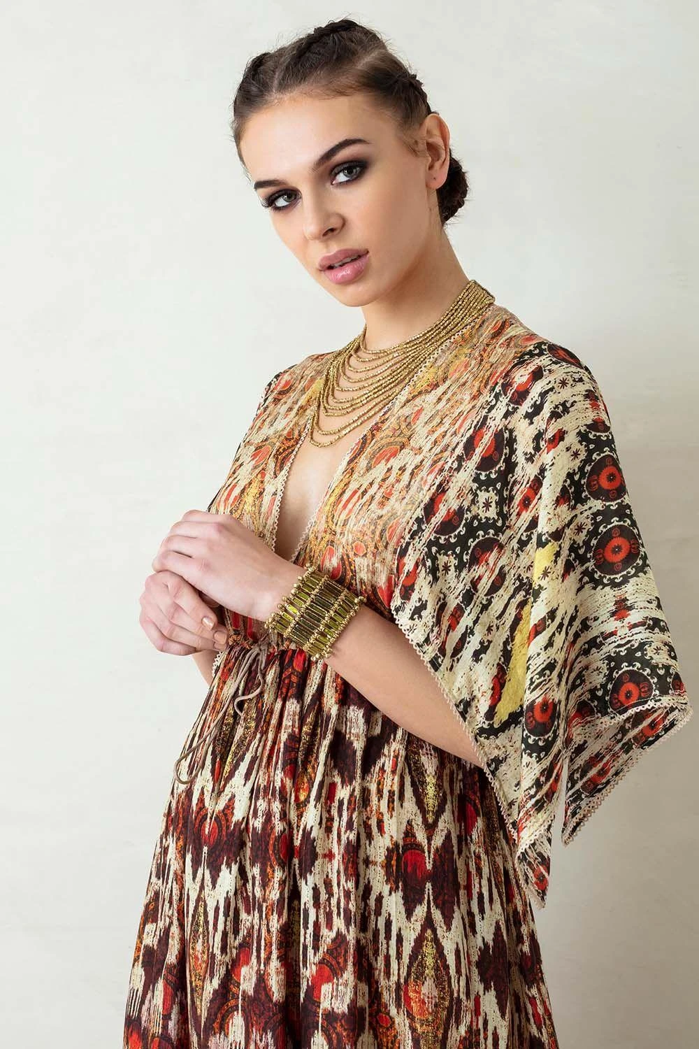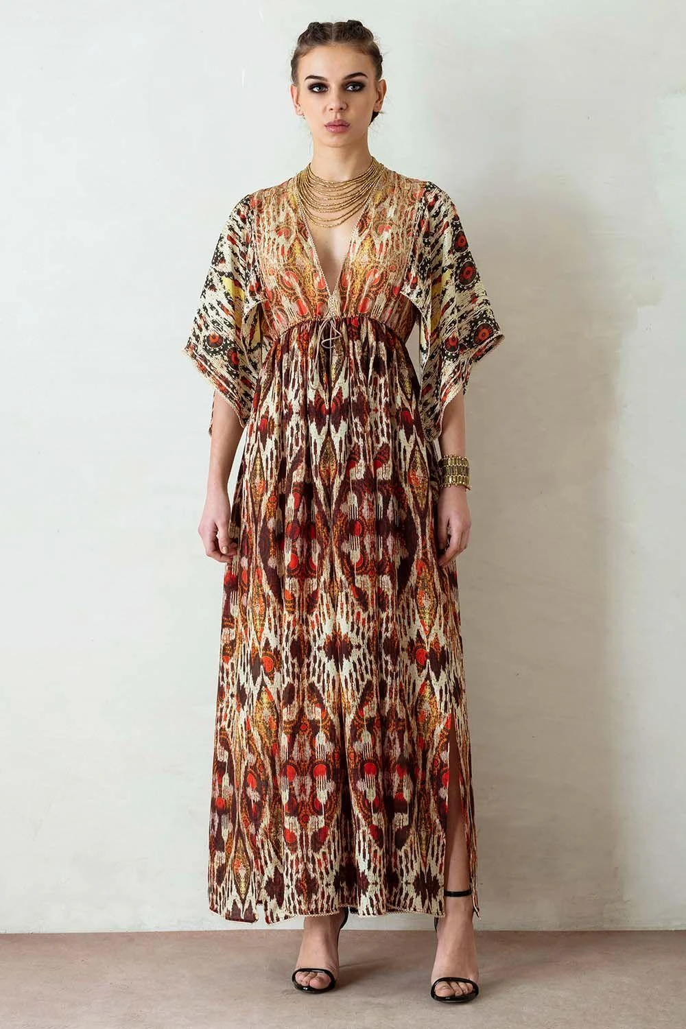 Nail your vacation look in this kaftan, rendering utmost comfort and edge. It is crafted in 100% silk with a drawstring waistline to shape, side slits and a deep appealing neckline. The striking colors and prolific prints just cannot be ignored.