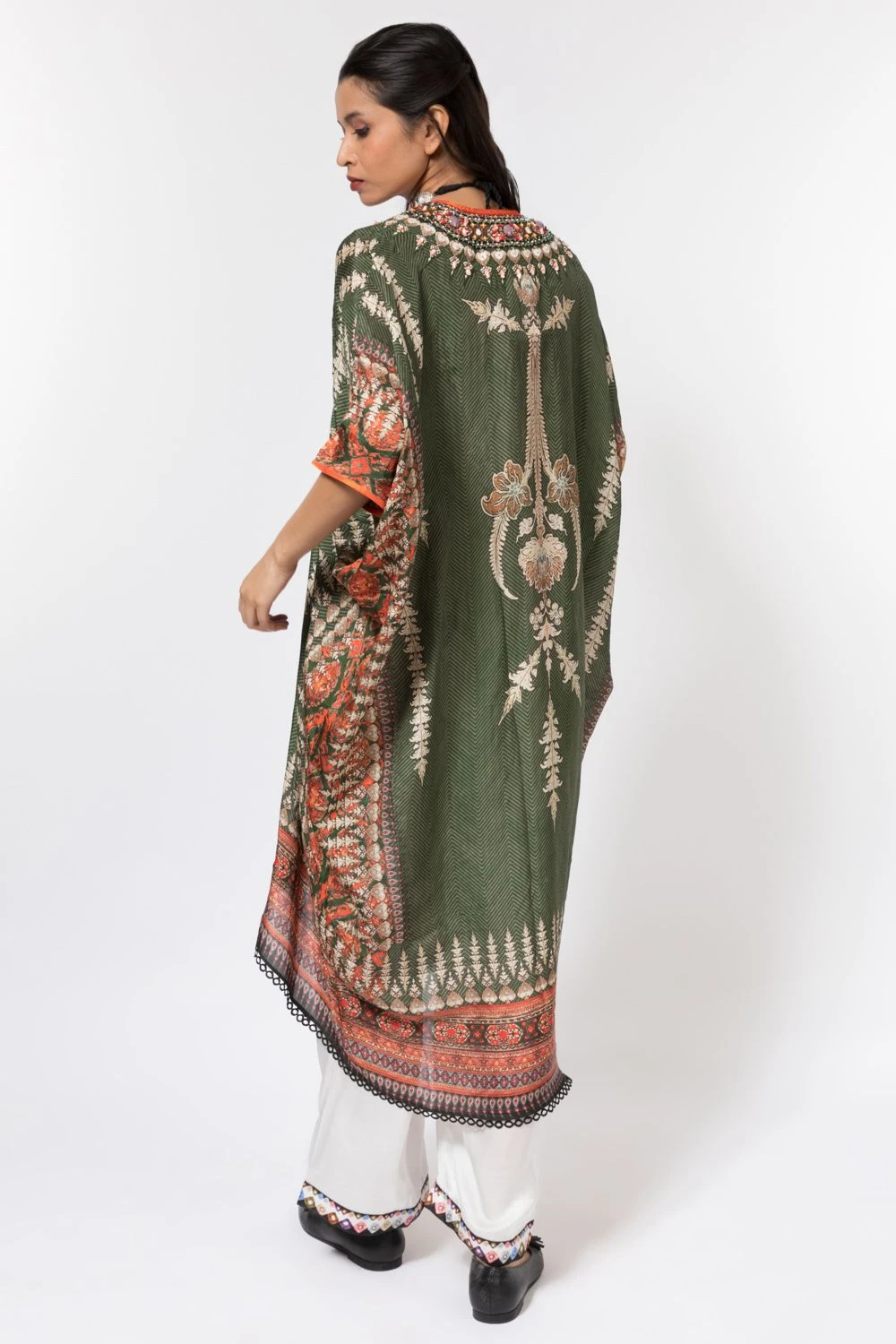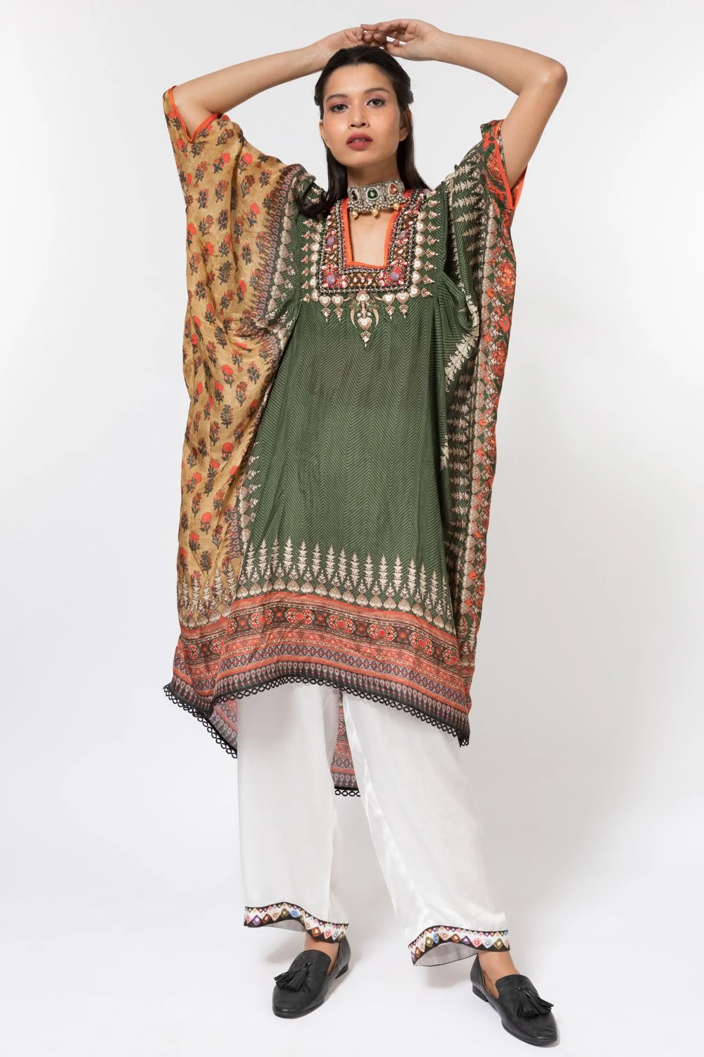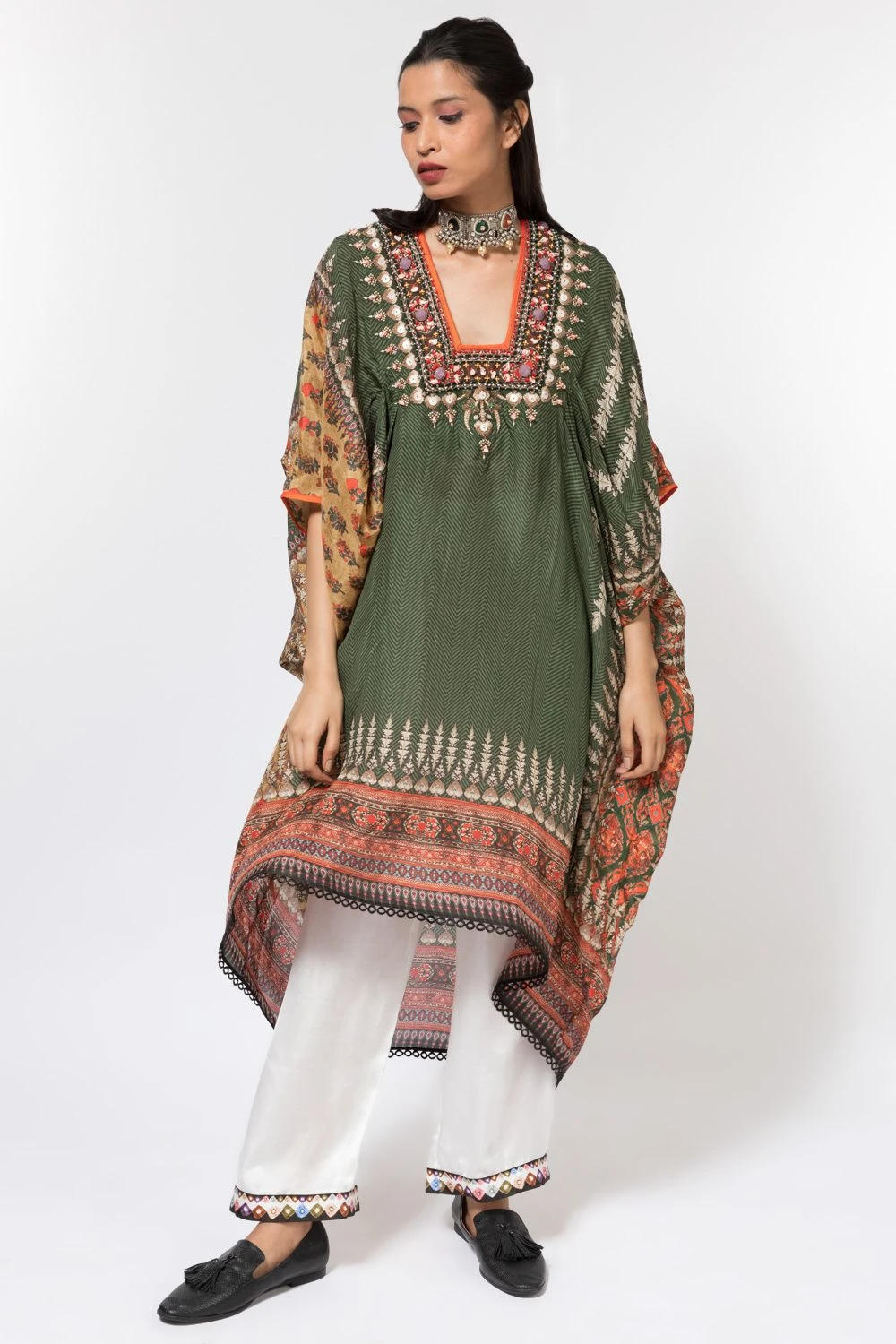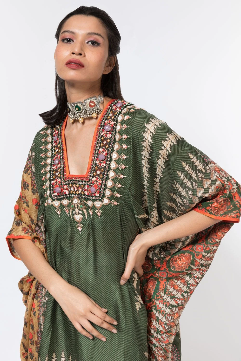 Take your holiday look a notch higher in this olive green printed dress. It is cut in sumptuous silk fabric in a draped silhouette and features an embroidered neckline yoke with french knots, beads, shells, & swarovski stones.