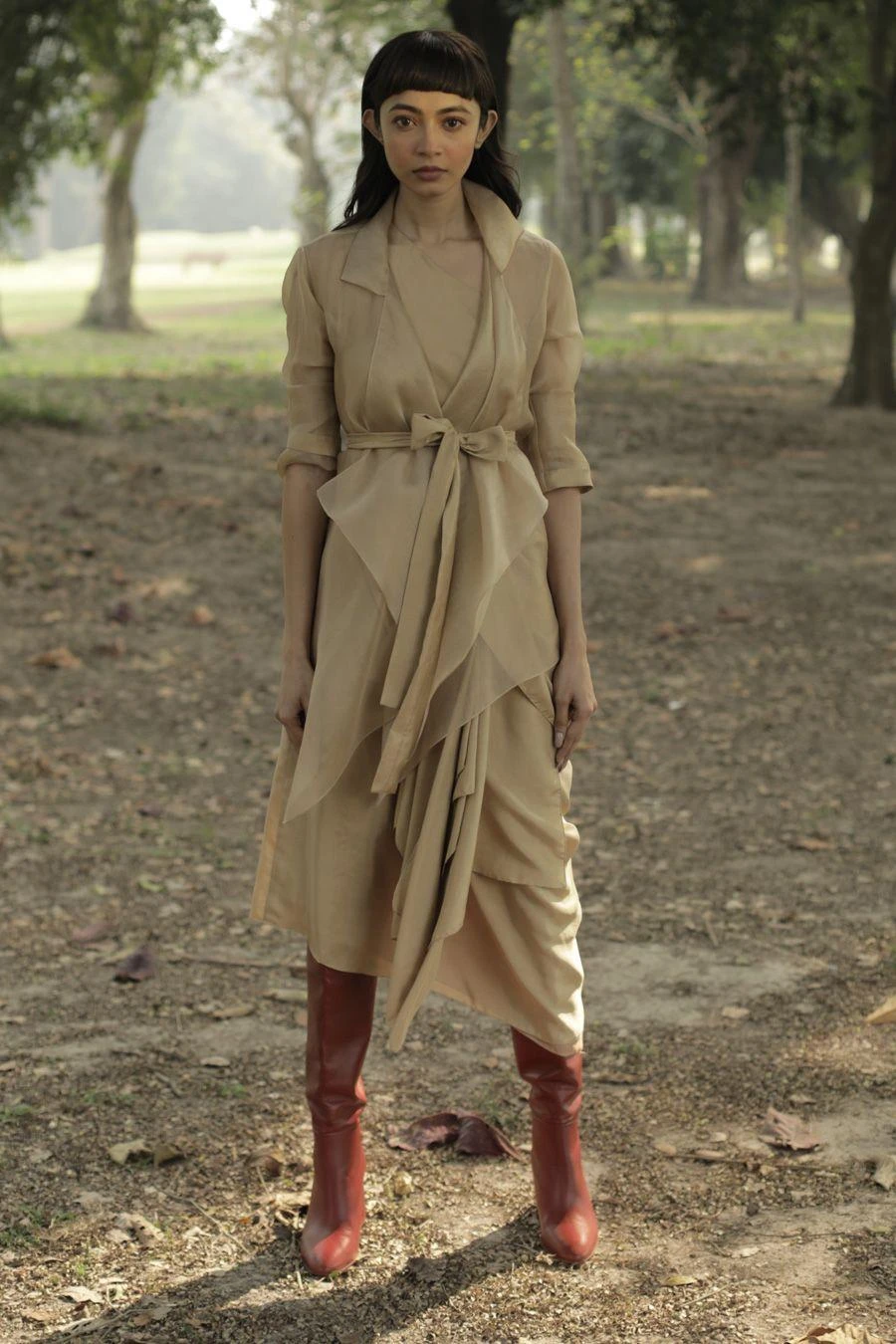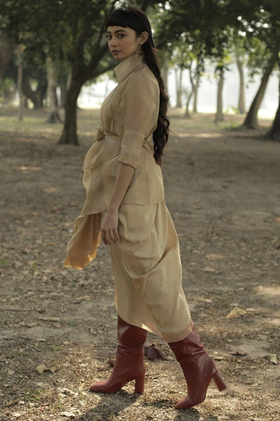 This jacket set falls in the realm of luxe minimalism. Crafted in silk organza, this set features a beige dress paired with a trench-style jacket and a belt. Add a pair of gold hoops to complete the look.