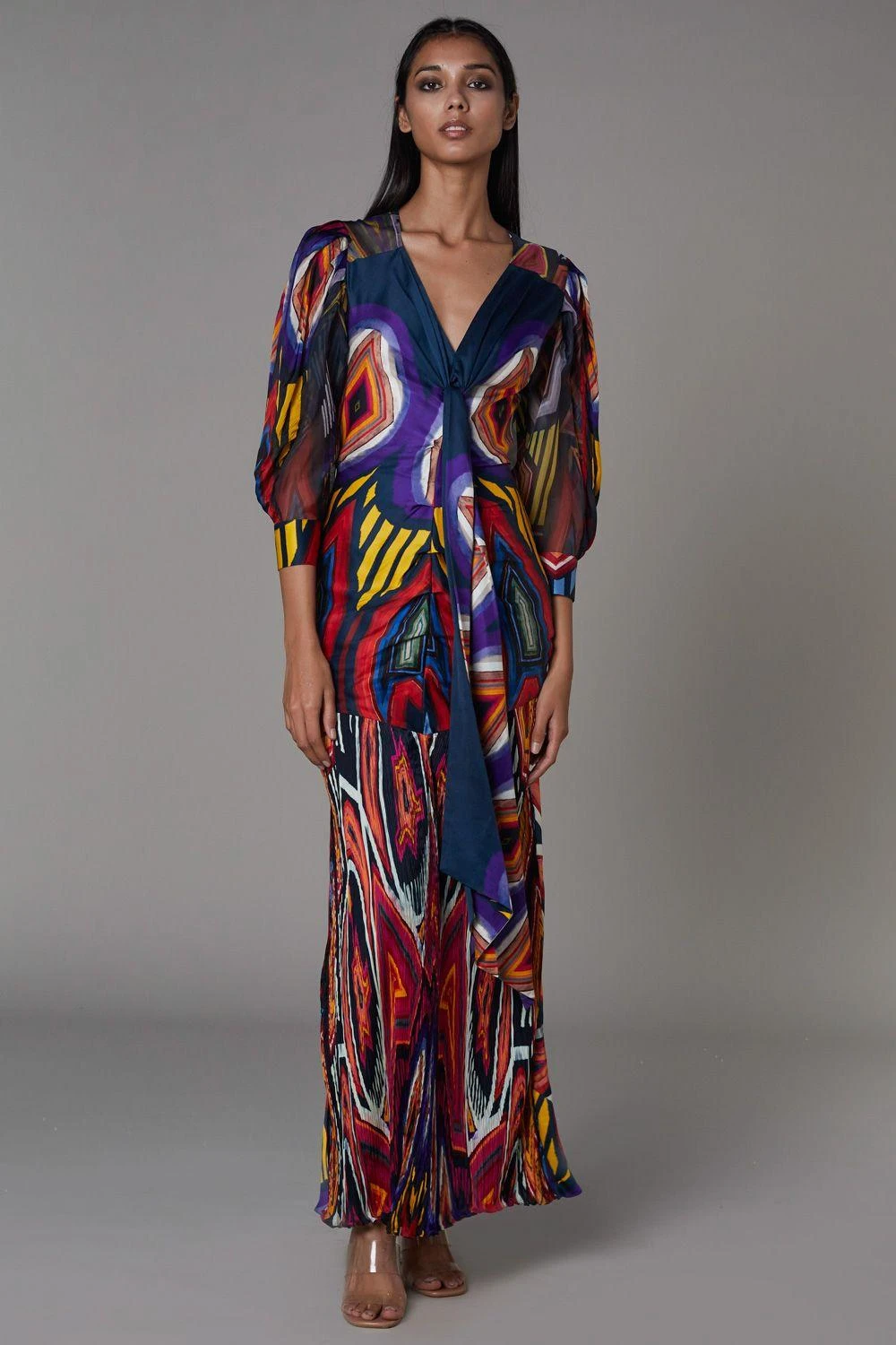 This statement abstract printed front knot dress is perfect for vacation. This elegant maxi dress can be styled with statement earrings for an evening soiree.