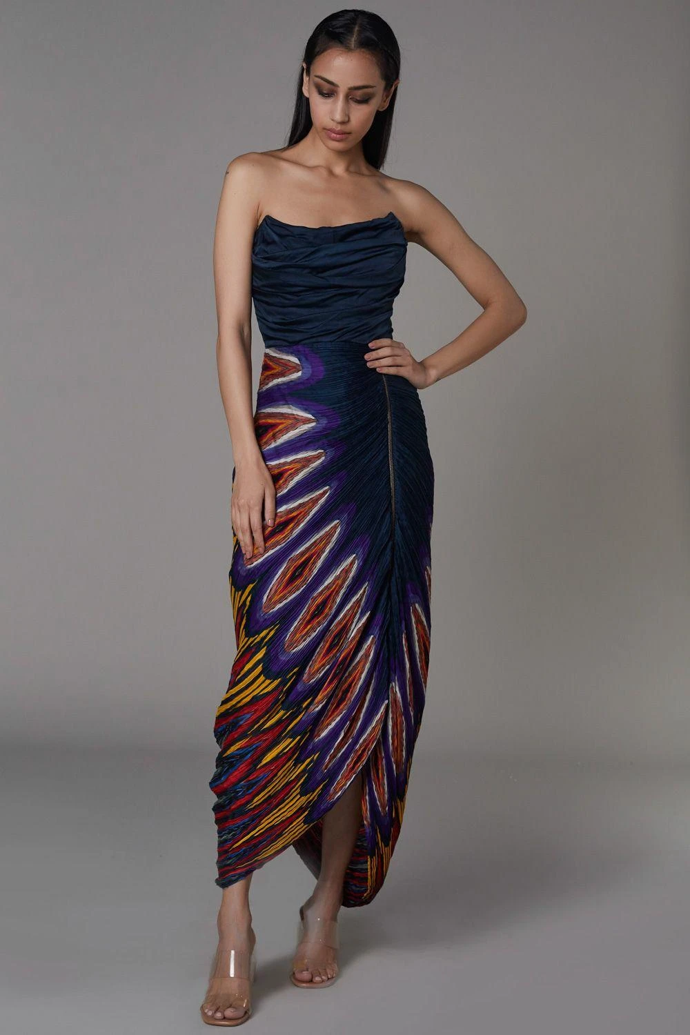Saaksha & Kinni gives a fresh & youthful spin to the sari silhouette with this avant-garde curation. This abstract printed corset style sari dress is engineered in micro pleated satin, cotton silk & chiffon. Style it for your evening soirees.
