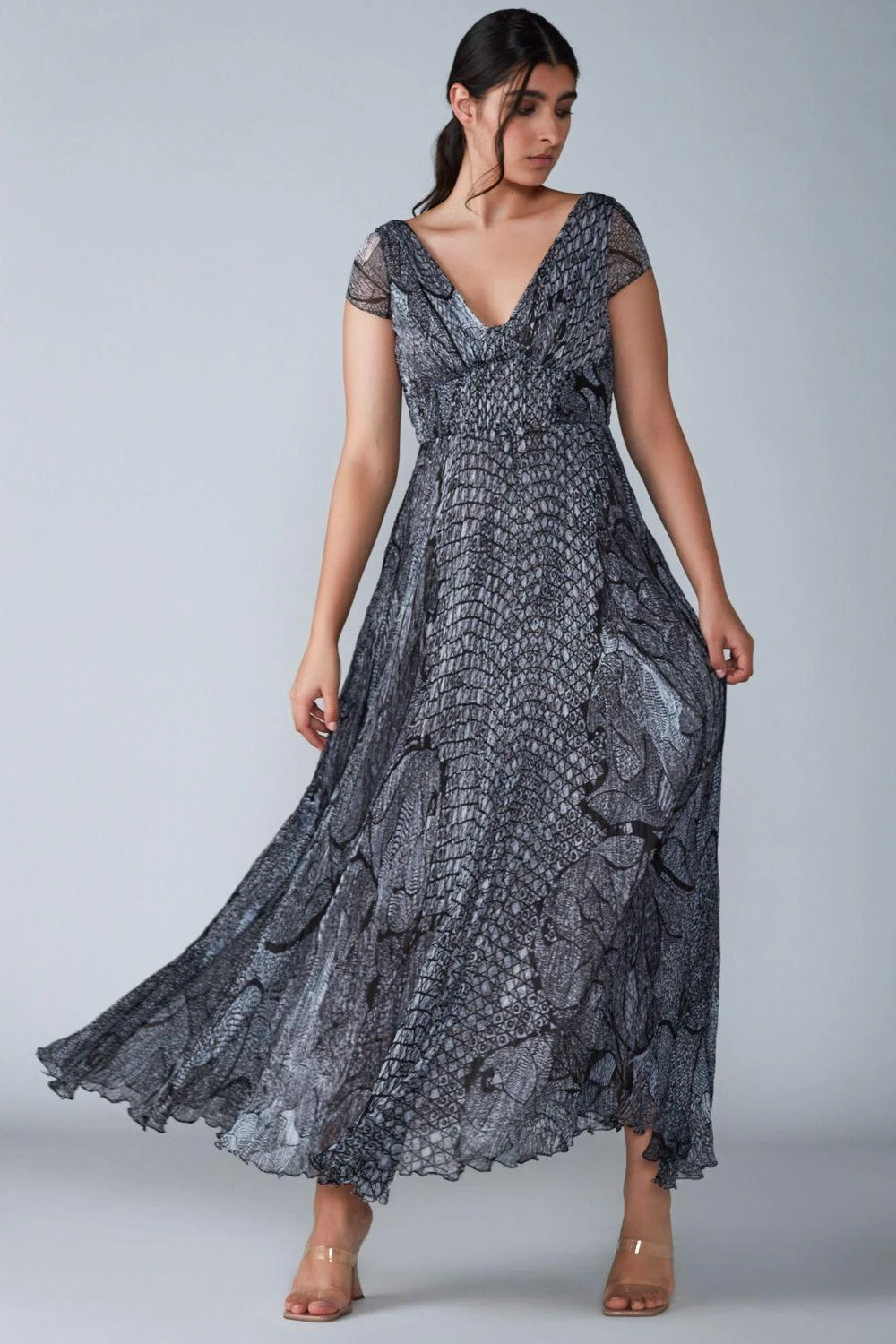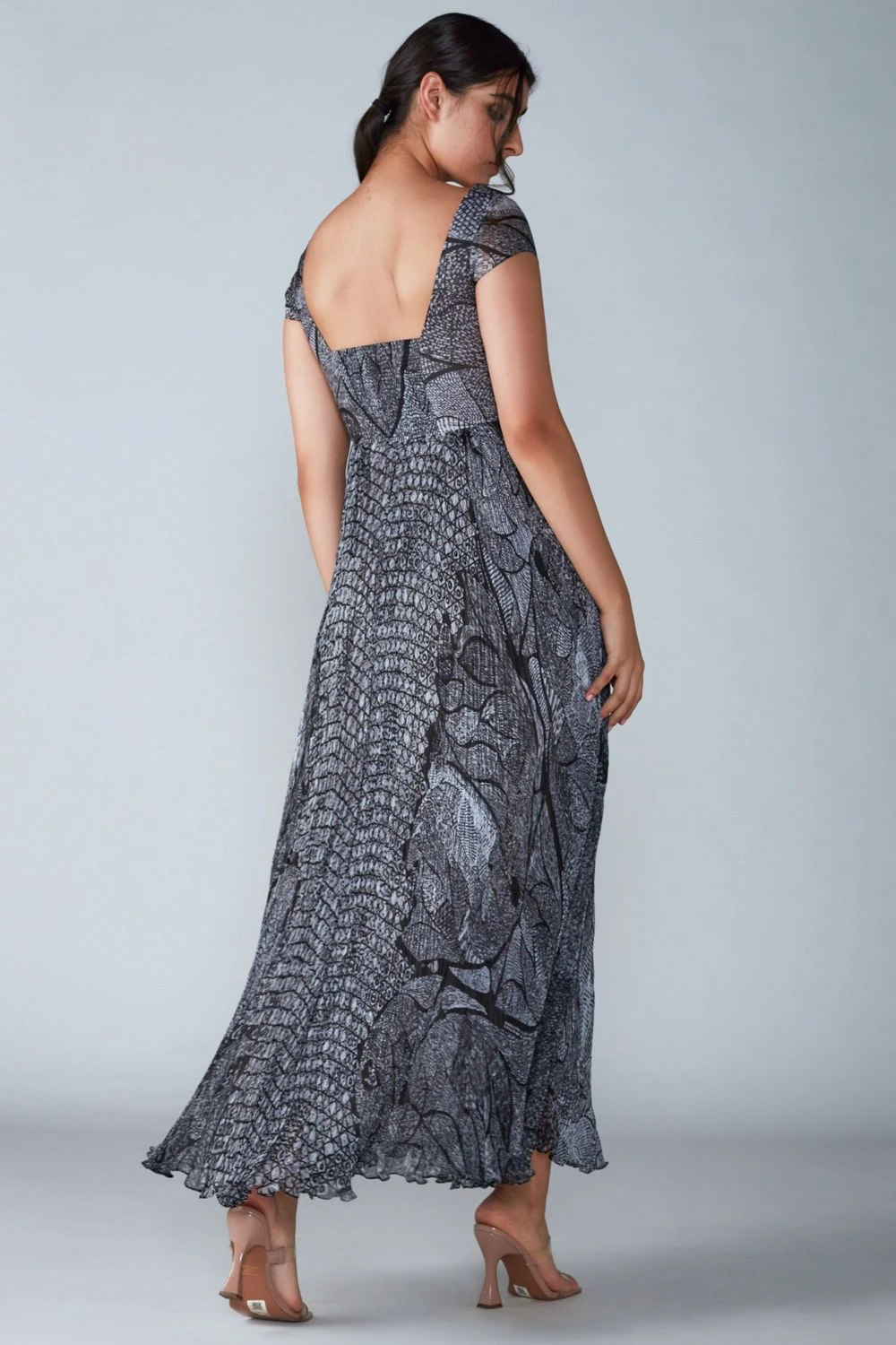 Add a layer of glamour and statement style to your resort getaways with this maxi dress. Crafted in chiffon, this micro pleated dress features an abstract tile print with capped sleeves. Style it with a pair of dangler earrings to complete the look.