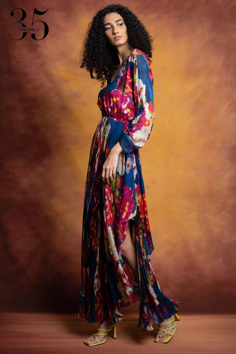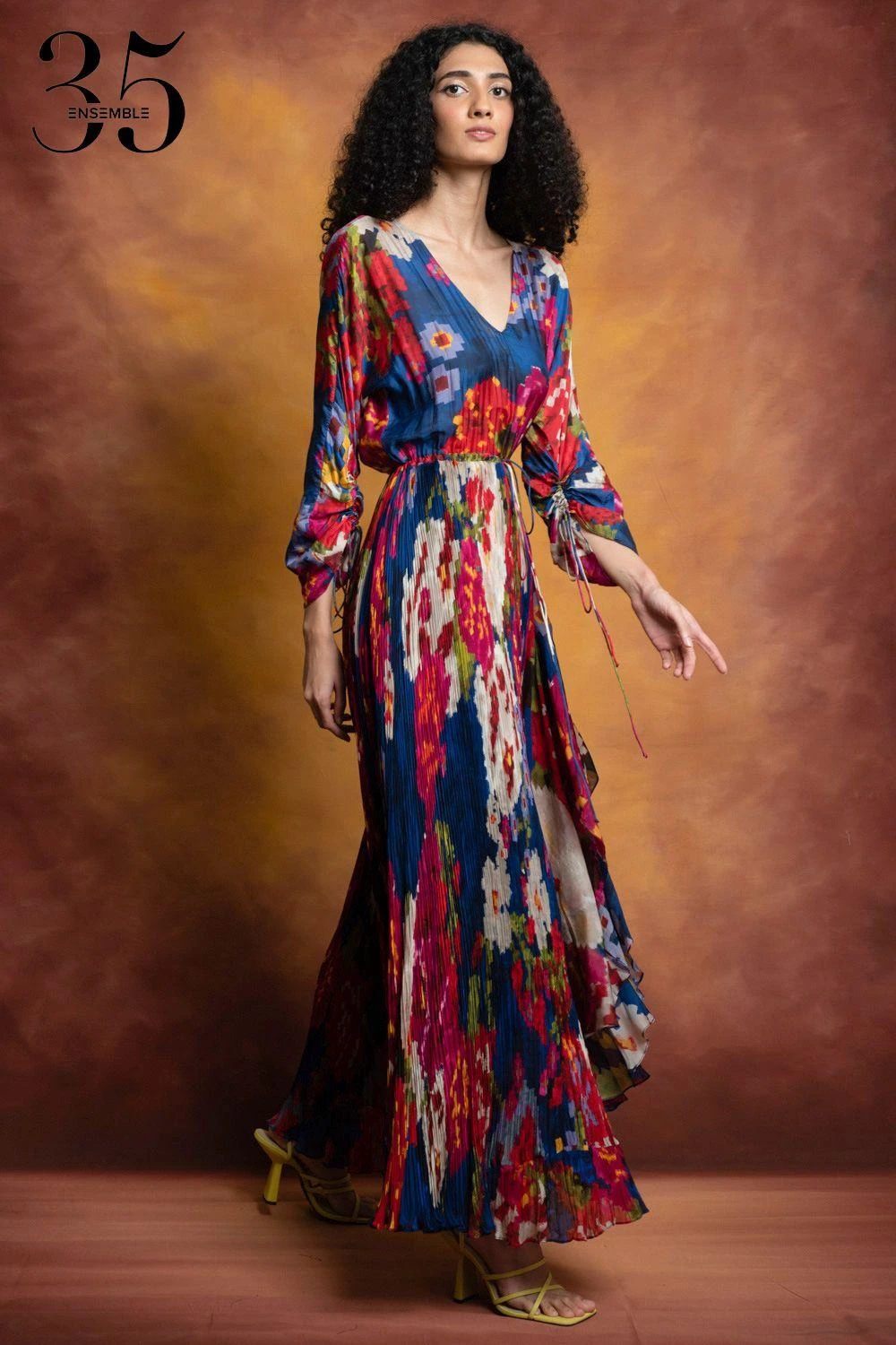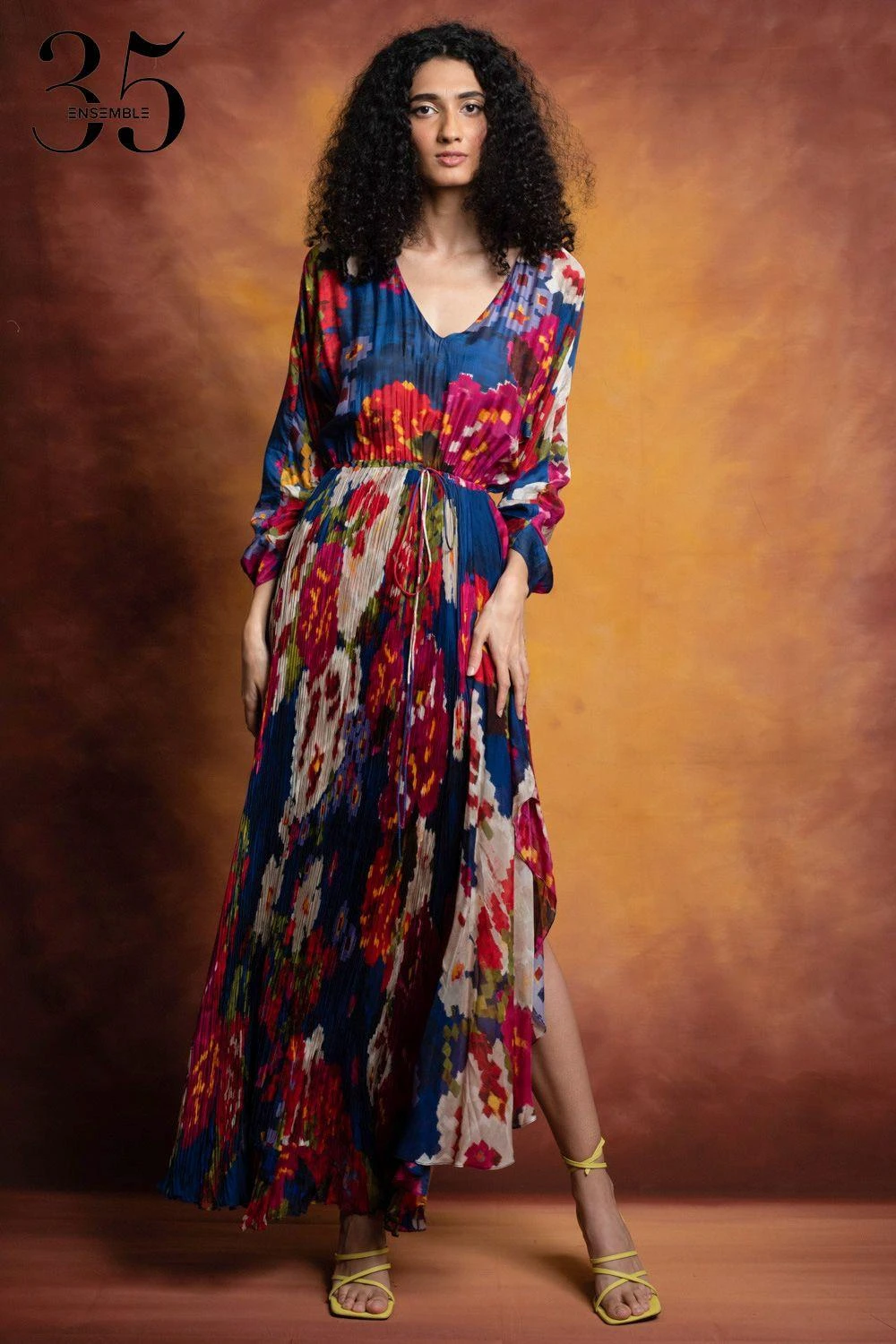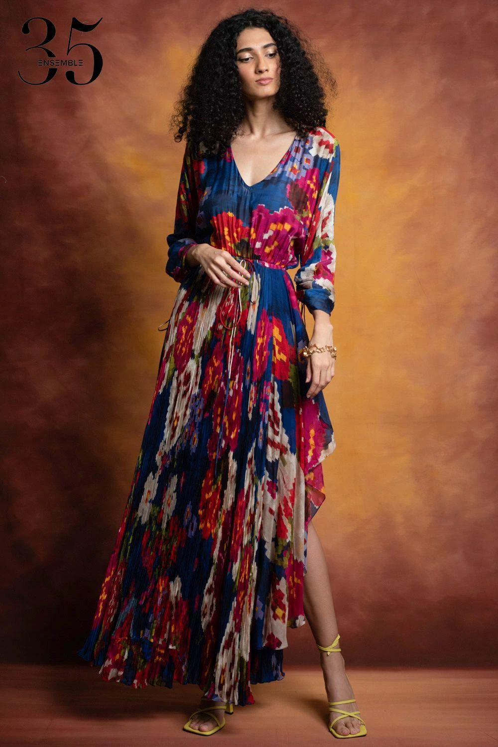 A yearlong celebration of its 35th anniversary telling the story of modern Indian fashion. Crafted in cotton silk & chiffon, this micro pleated dress features a floral print, an asymmetric hem, adjustable sleeves & waist with an attached inner slip.