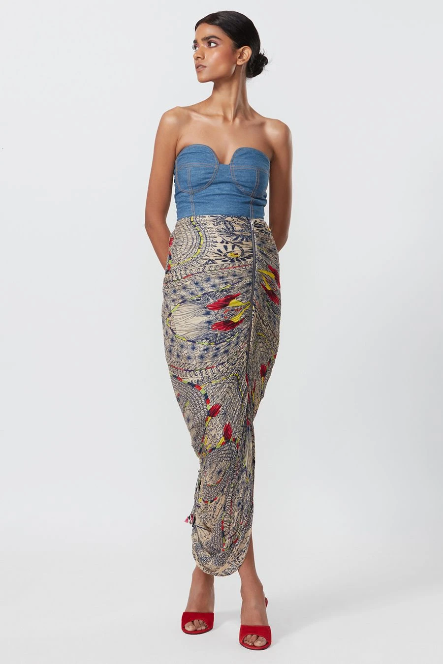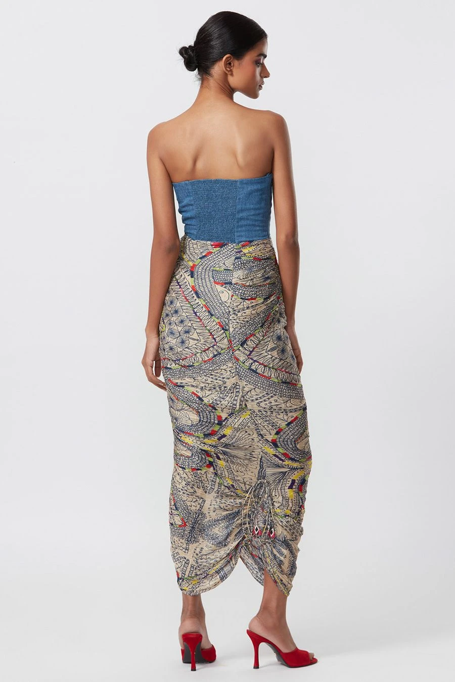 Add a layer of statement and glamour to your resort getaways with this dual tone dress. Crafted in cotton silk & denim, this dress features a corseted denim bodice with a micro pleated bottom. Add a pair of dangler earrings to complete the look.