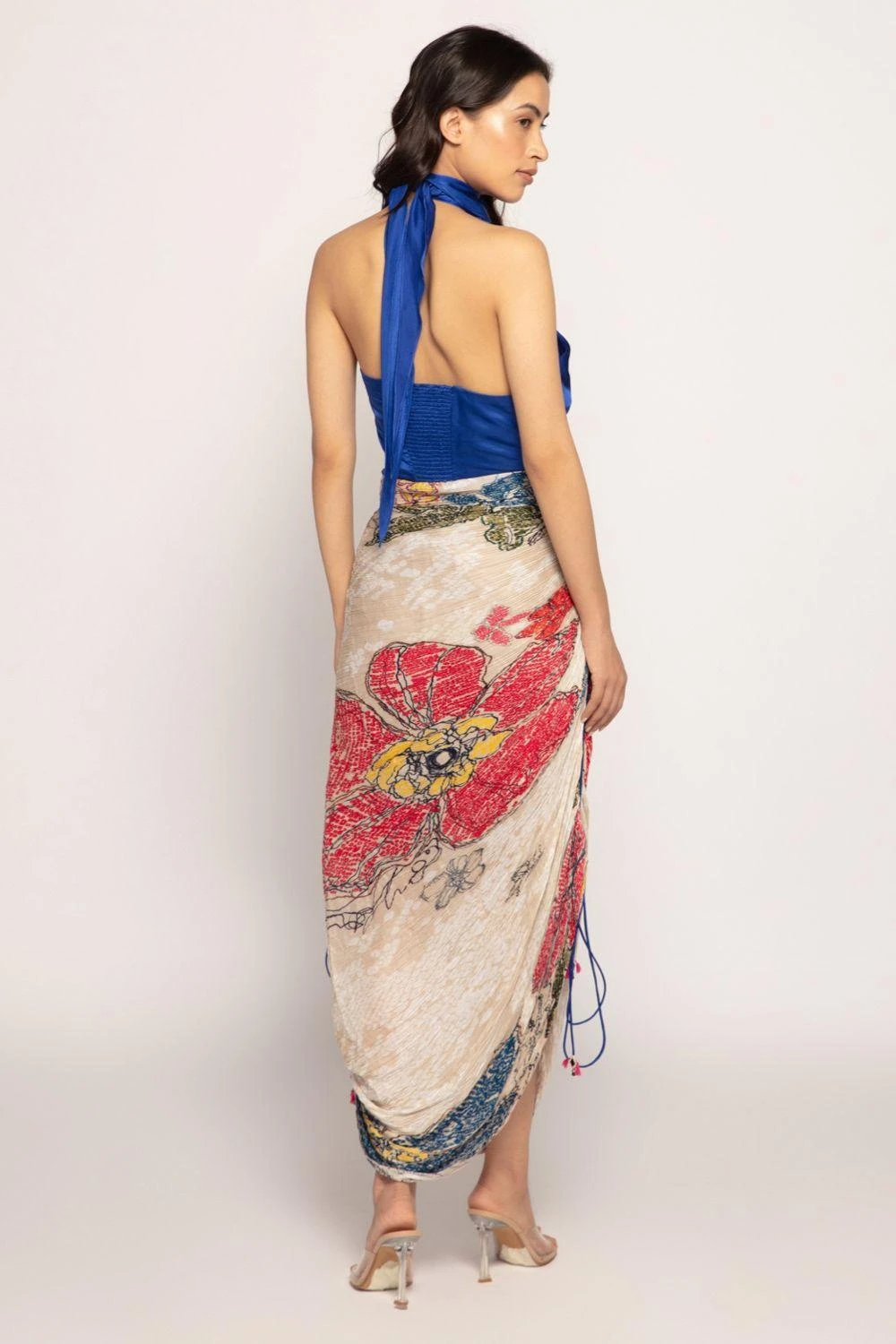 Experience elegance with this Dual Periwinkle Bandhani and Solid Hand Micro Pleated Halter Neck Dress. Featuring keyhole detailing and adjustable length, it’s a blend of style and versatility.