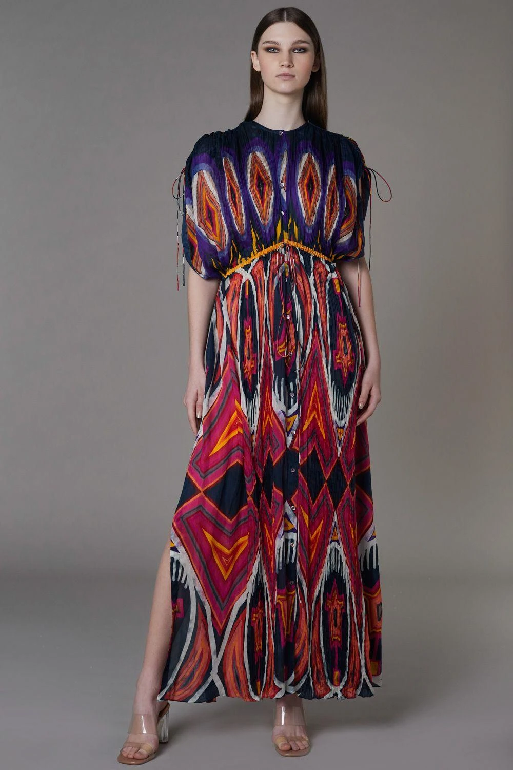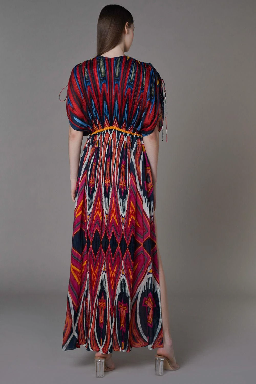 This bohemian abstract printed kaftan dress is crafted using hand micro pleating details in cotton silk. It has customisable side slits & features drawstring detail in the front and on the sleeves.