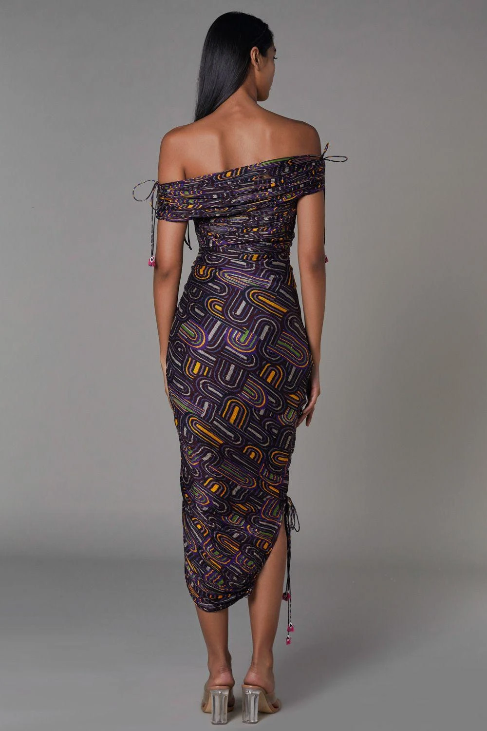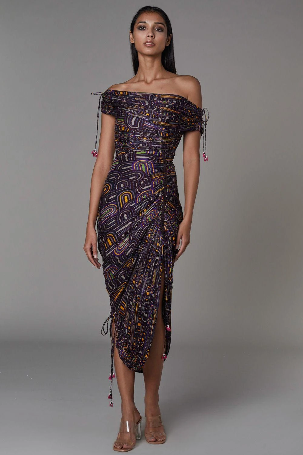 Saaksha & Kinni gives a fresh & youthful spin to the sari silhouette with this avant-garde curation. This semi-circle printed off-shoulder sari dress is engineered in micro pleated cotton silk with drawstring detail to adjust the length.