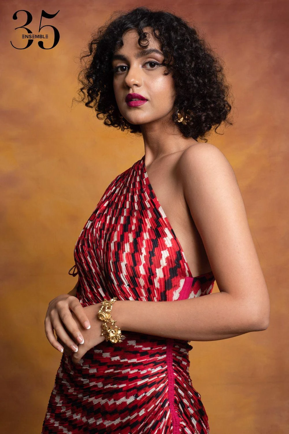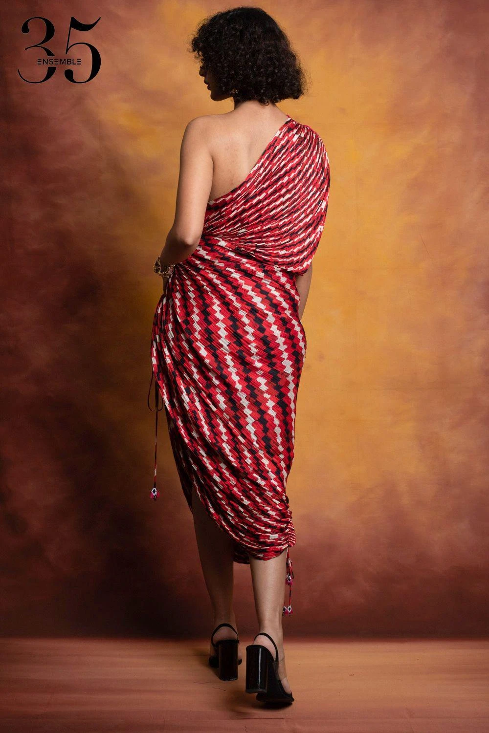 A yearlong celebration of its 35th anniversary telling the story of modern Indian fashion. With this avant-garde selection, give the sari silhouette a new spin. This micro pleated sari dress has adjustable sleeves & length with a checkered print.