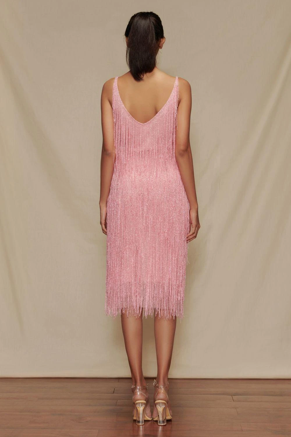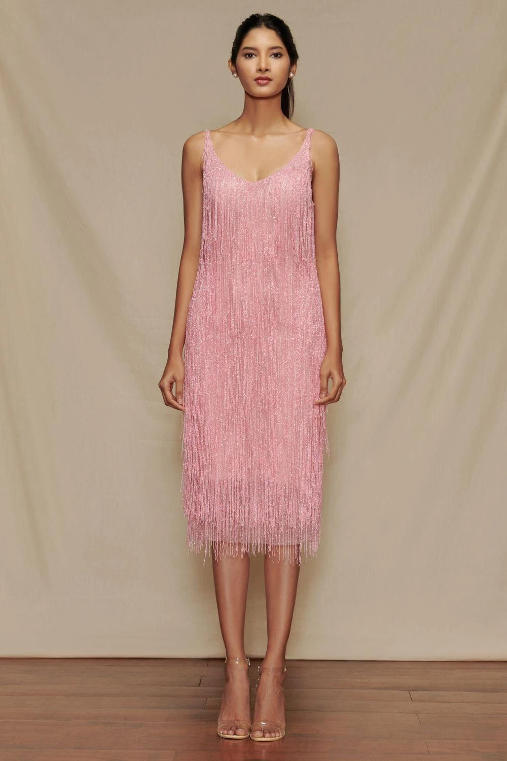 Look like a modern day princess in this baby pink midi dress. It is made in a soft tulle base and accentuated with glass bead fringes all over. You can elevate your look with a matching capelet from the collection.