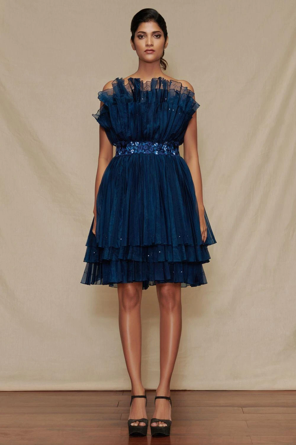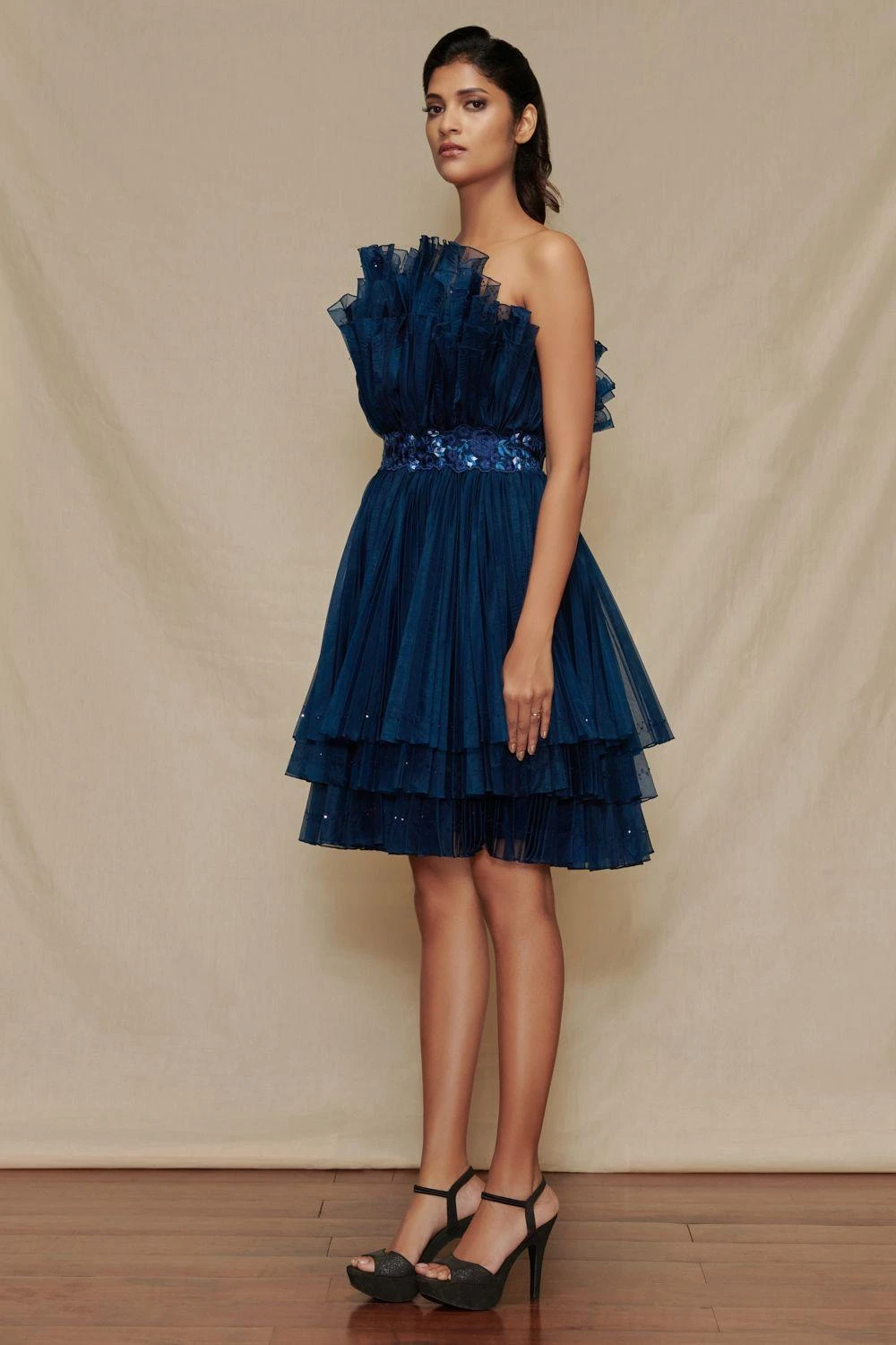 Attain an elegant and fierce look in the same outfit with this pre-pleated navy dress. Made with meticulous craftsmanship, this dress features Shriya Som signature cabbage ruffles and is accentuated with an embroidered belt.