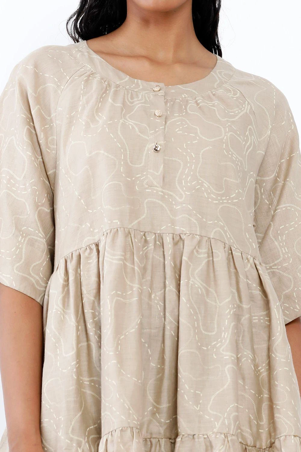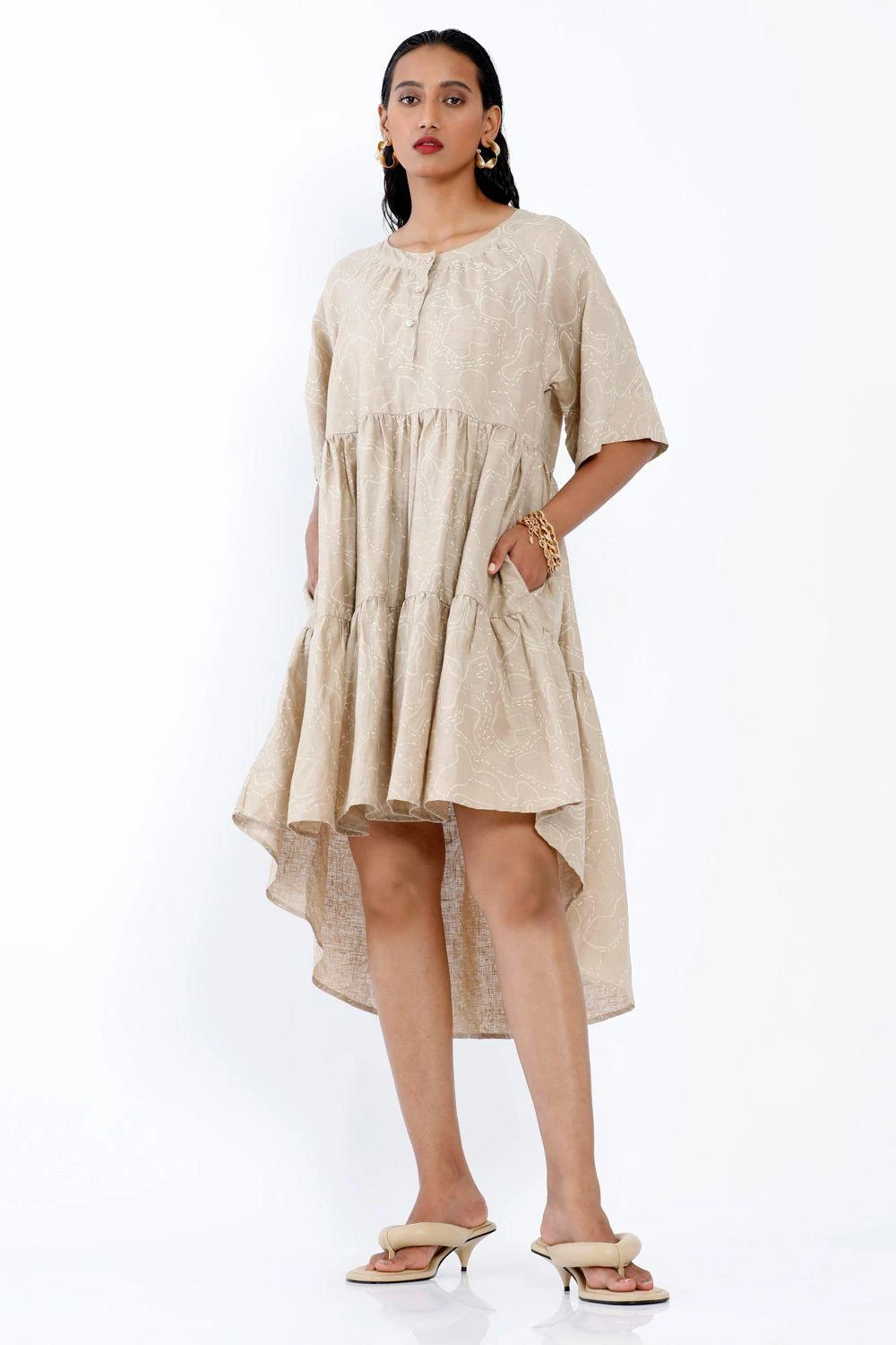This beige tiered mini dress is perfect for warm summer days. Style this playful piece with subtle gold hoops & a layered necklace set for a casual daytime look.