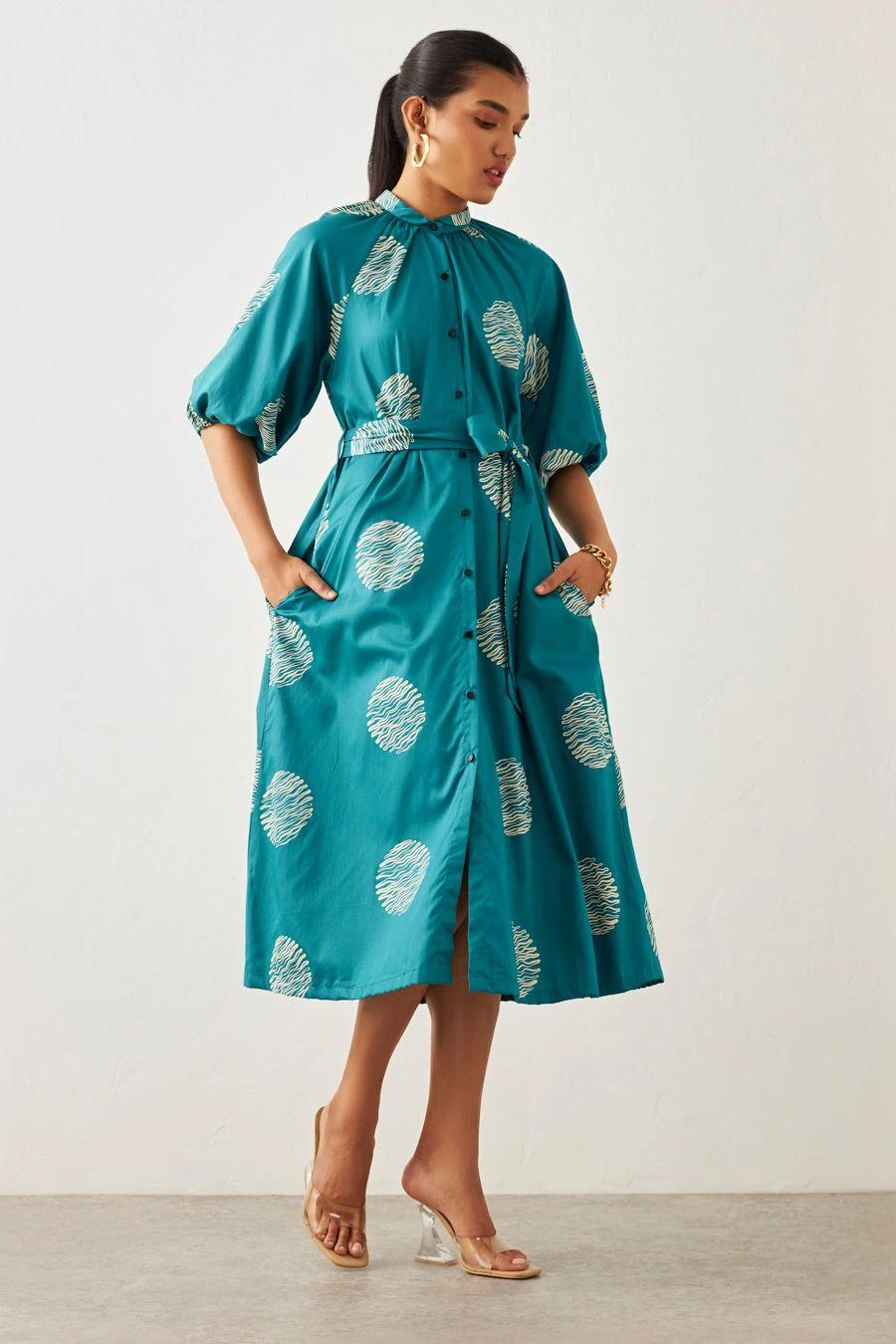 From your work desk to the brunch table & from lounging at home to catching flights, you can always count on this dress. Crafted in cotton, this ripple print dress features a unique collar with a tie up a belt and voluminous sleeves.