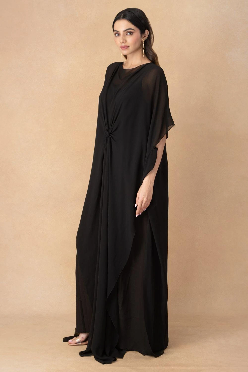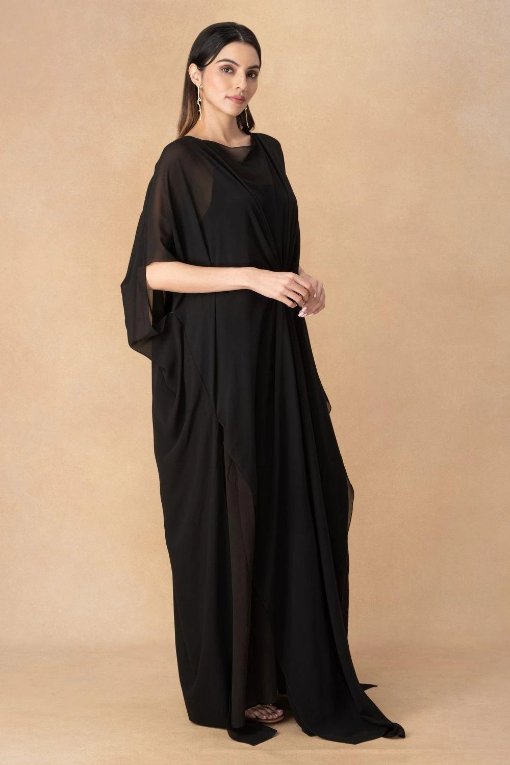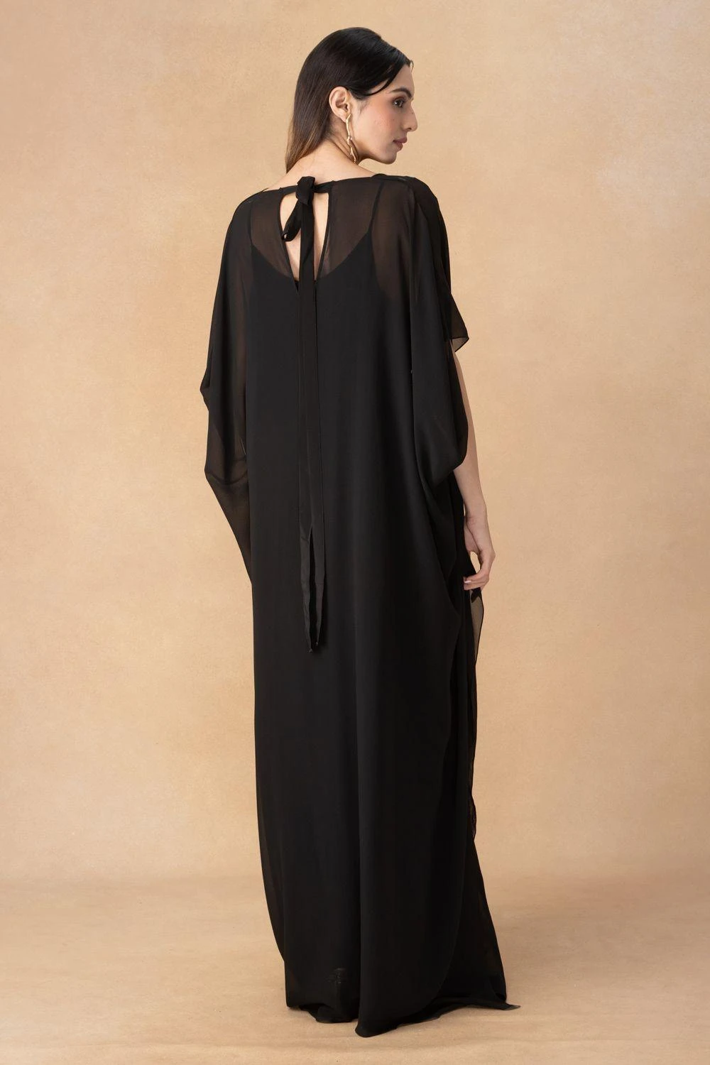 Luxe fabrication & flattering, easy silhouette, make this black maxi dress set a wardrobe must have. The high neck dress is cut in silk satin georgette, paired with a slip. Style this set with a pair of crystal drop earrings.