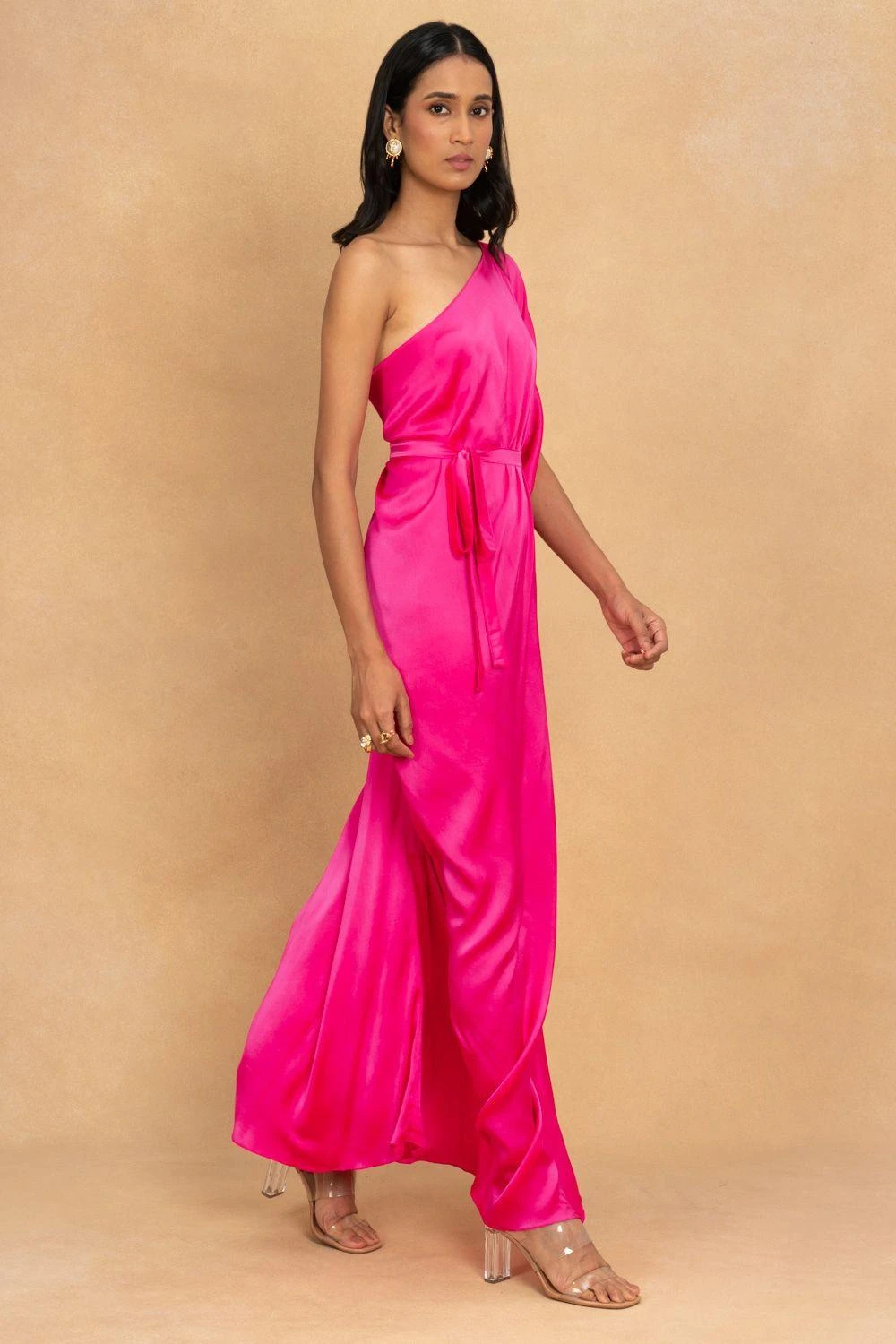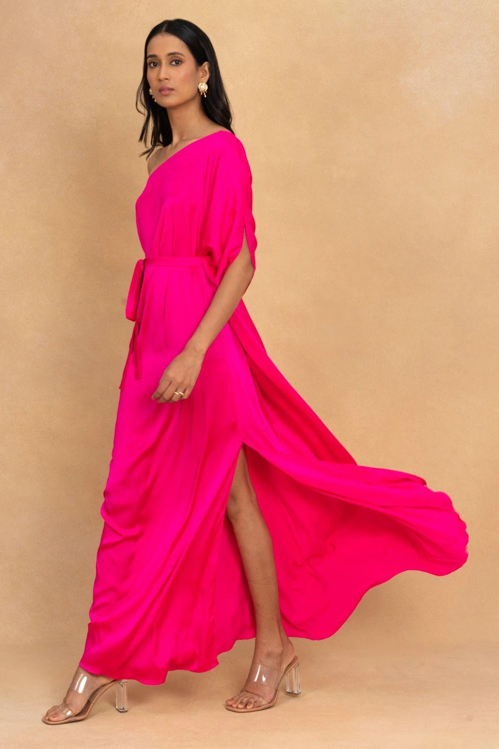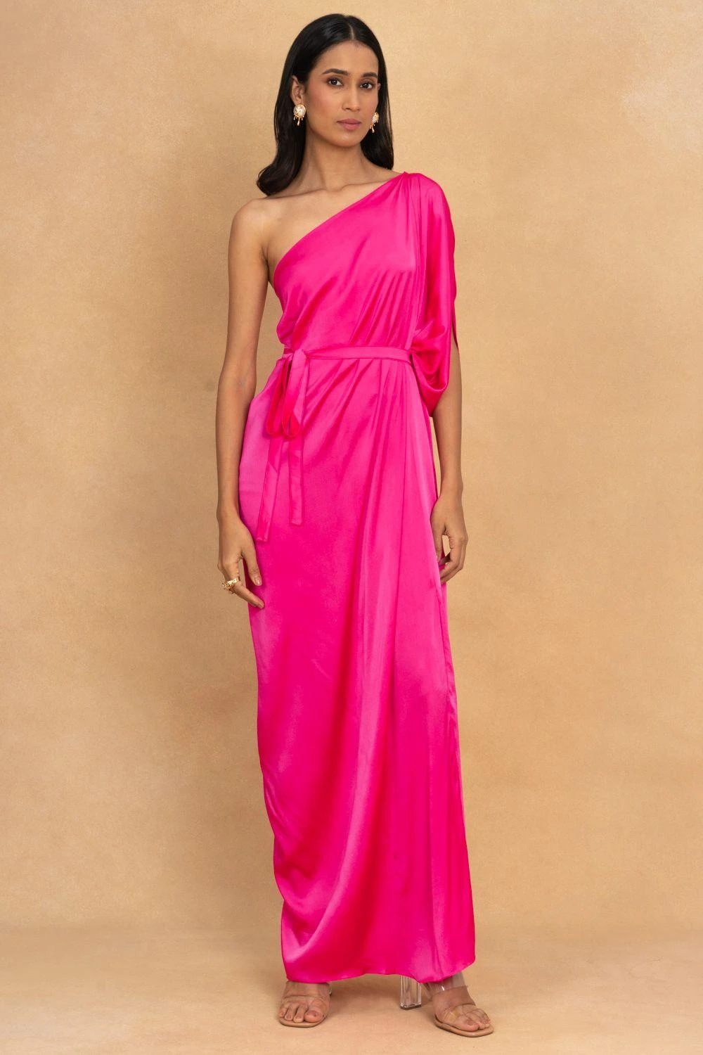 Make the most of summers in this easy-breezy one shoulder dress in silk satin. It is enhanced with a draped detail and comes along with a matching belt to adjust the waist. Style it with a pair of drop earrings & heels.