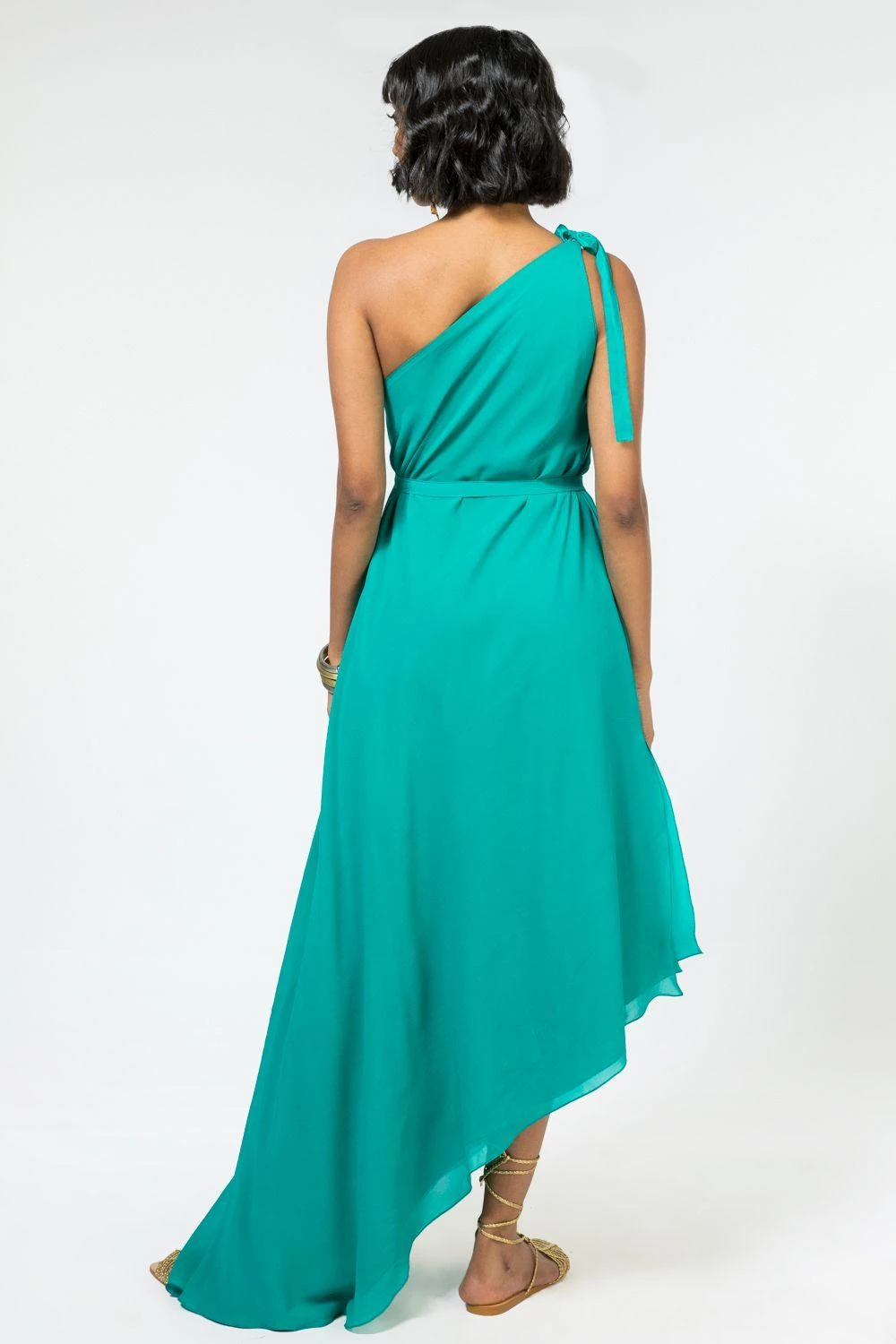 Amp up your vacation looks with this sea green one shoulder dress. It is cut in silk georgette in an asymmetric silhouette with a shoulder tie. You can cinch your look with a fabric belt that comes along.
