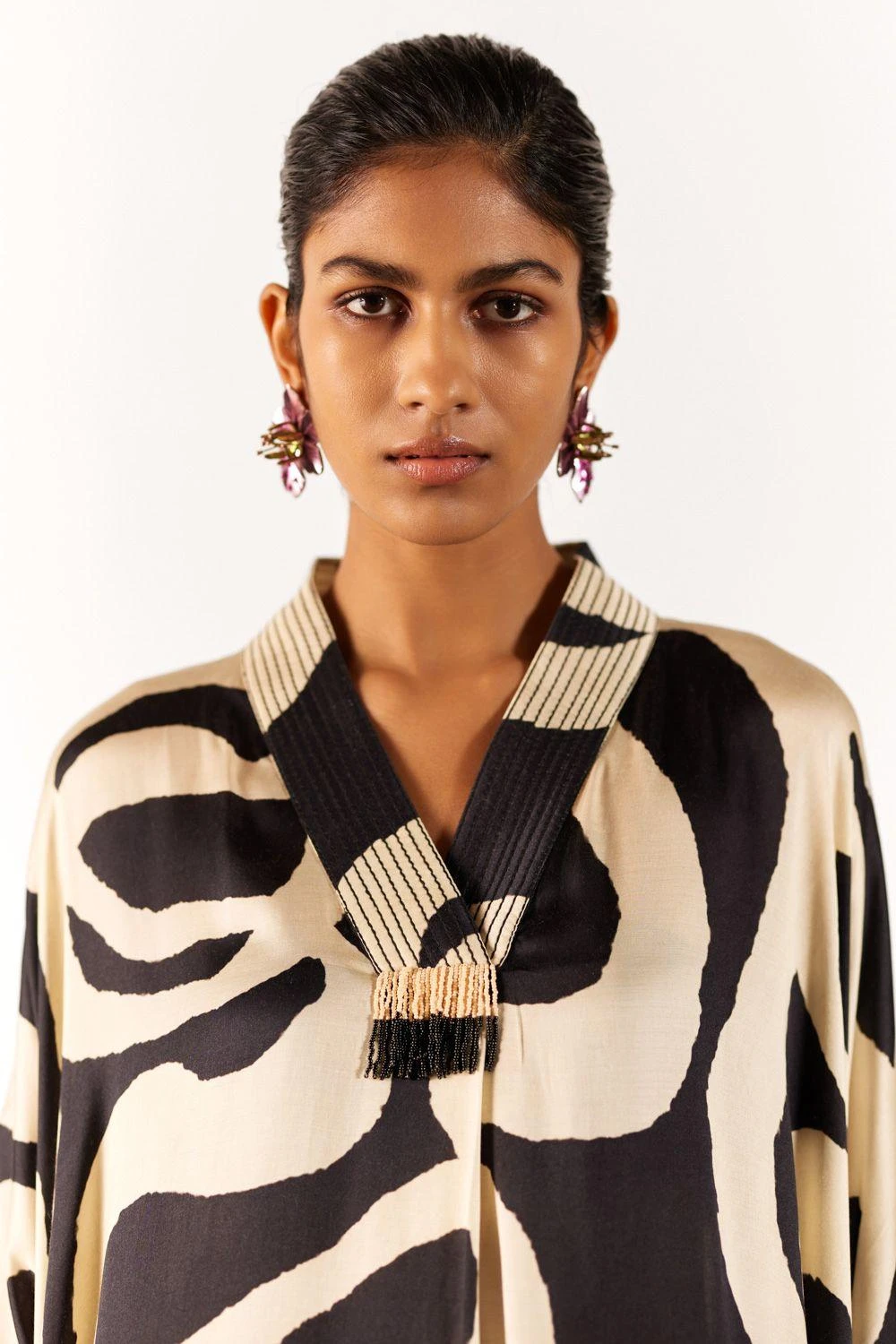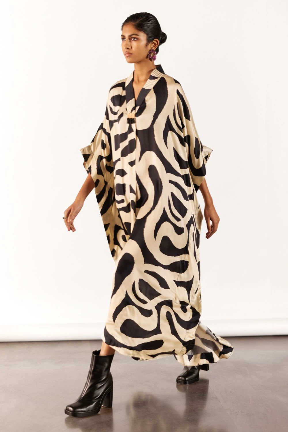 Embrace opulence in the vegan silk Chestnut Kaftan. With intricate chestnut print, V-neckline & kimono sleeves, this free size piece offers versatility. Enhanced with delicate bead details, it’s the epitome of chic elegance when paired with heels.