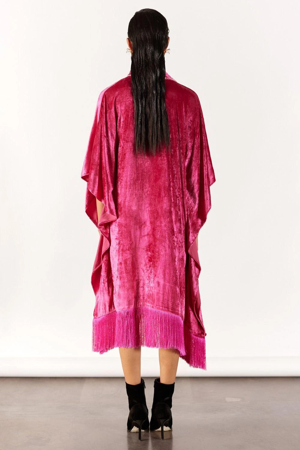 Embrace luxury in this Miller Kimono. This trans-seasonal marvel, hand-dyed in opulent velvet, boasts a free-sized fit. Adorned with a high neckline, Swarovski crystals, graceful drapes & fringes, it’s the epitome of elegance, perfect for parties.