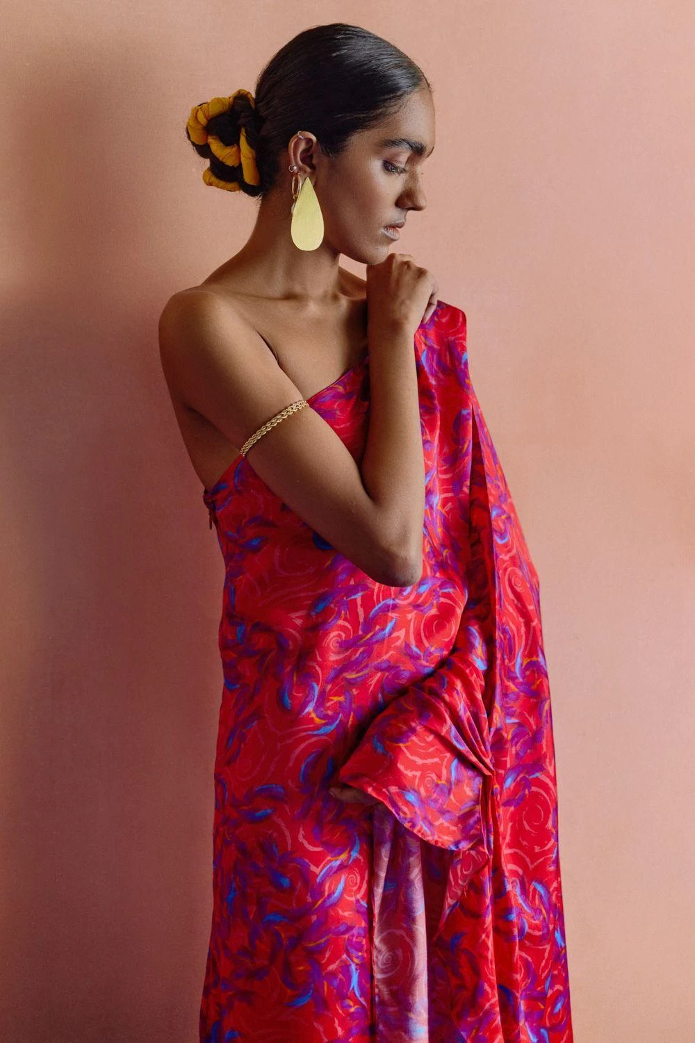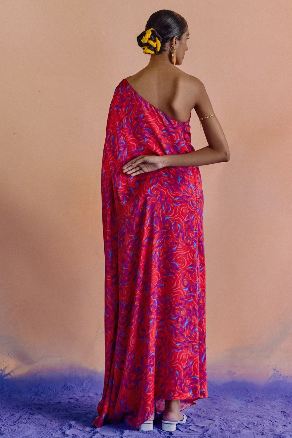 This parker one shoulder maxi dress is crafted in digitally printed vegan silk, making it a trans-seasonal & statement piece. It features drape detail on shoulder flowing down to a cascading sleeve. Style it with a pair of hoops for an evening out.