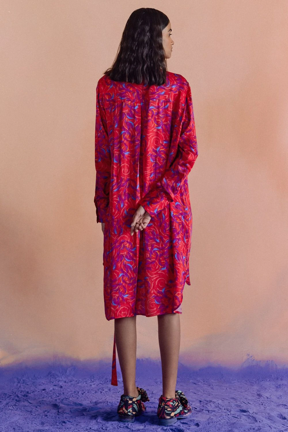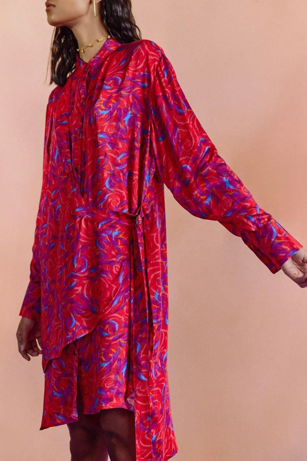 This parked shirt dress is cut in digitally printed vegan silk in a relaxed fit with an inbuilt waist tie & drape detail. The luxe fabrication & versatile silhouette offers the option to either dress down or up, according to your aesthetic.