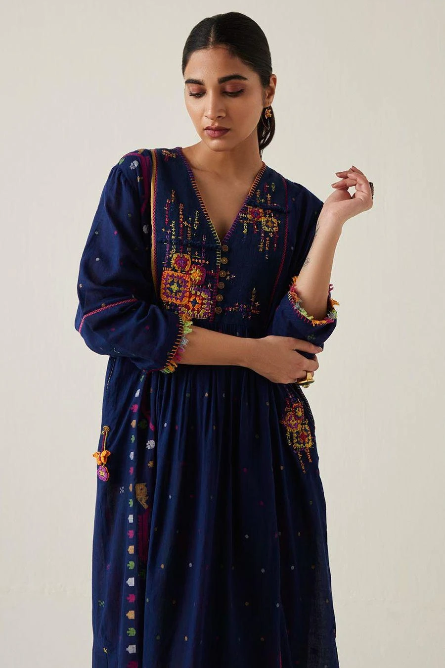 This easy slip on jamdani muslin dress features a front gathered yoke & striped smocked back yoke with a V-neck & long sleeves with fray details. The intricate multicoloured crocheted knitted patches & blocks are stitched on a loom.