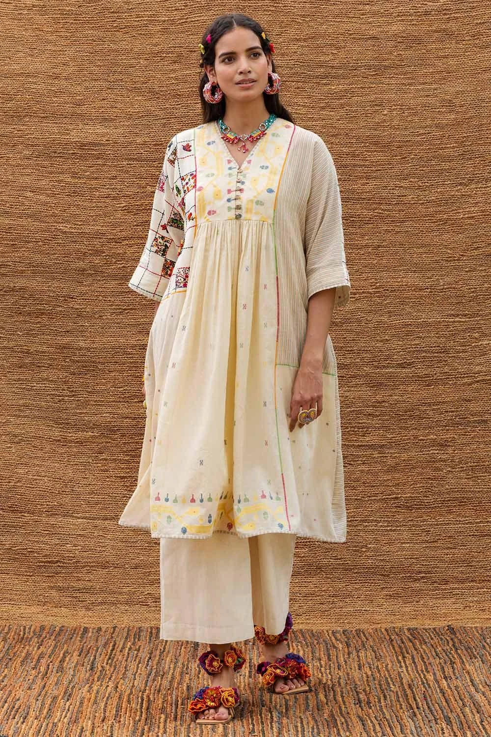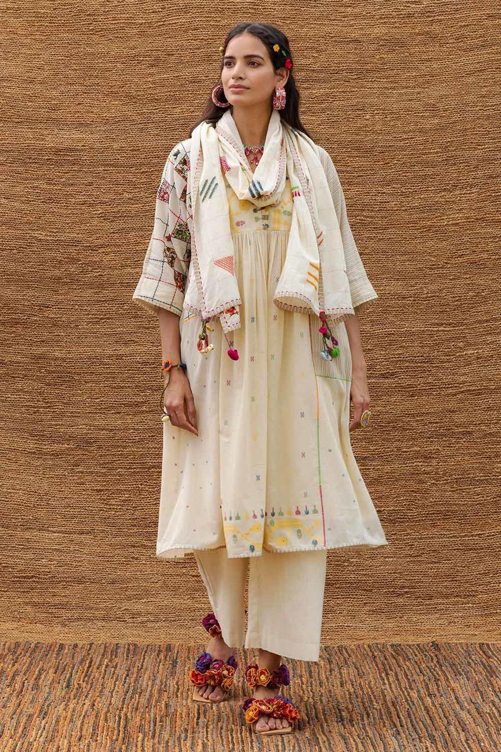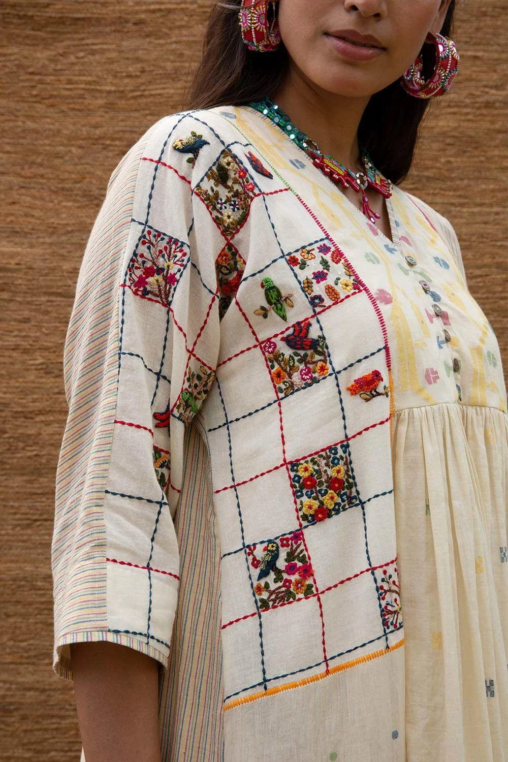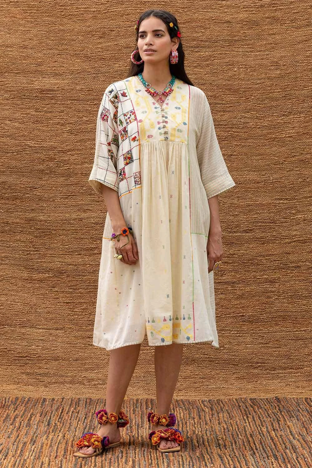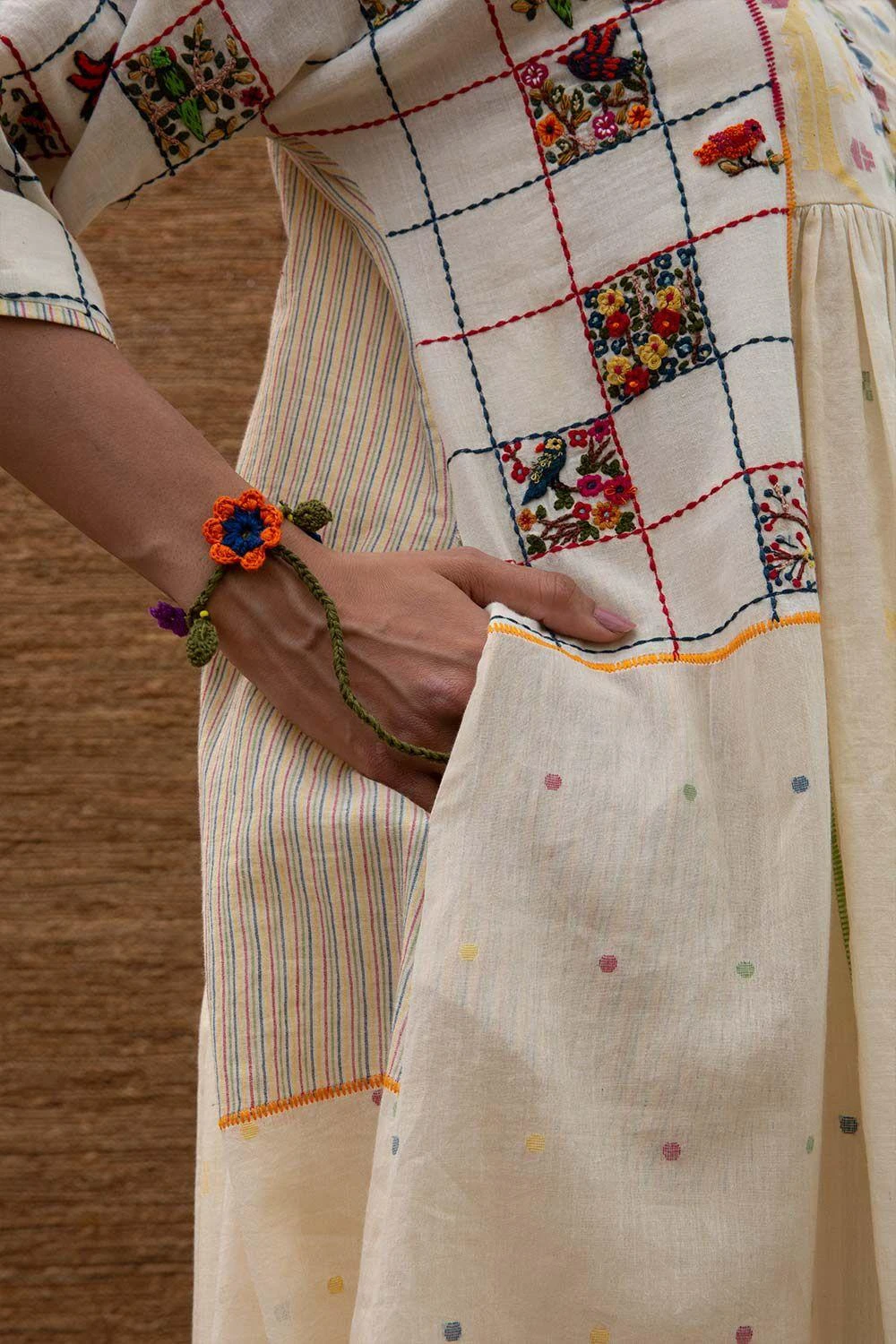 This easy slip on jamdani muslin dress is what you need on a balmy summer day. It has a front & back gathered yoke with dropped shoulders, fetching comfort. The floral thread embroidery adds grace to this piece.