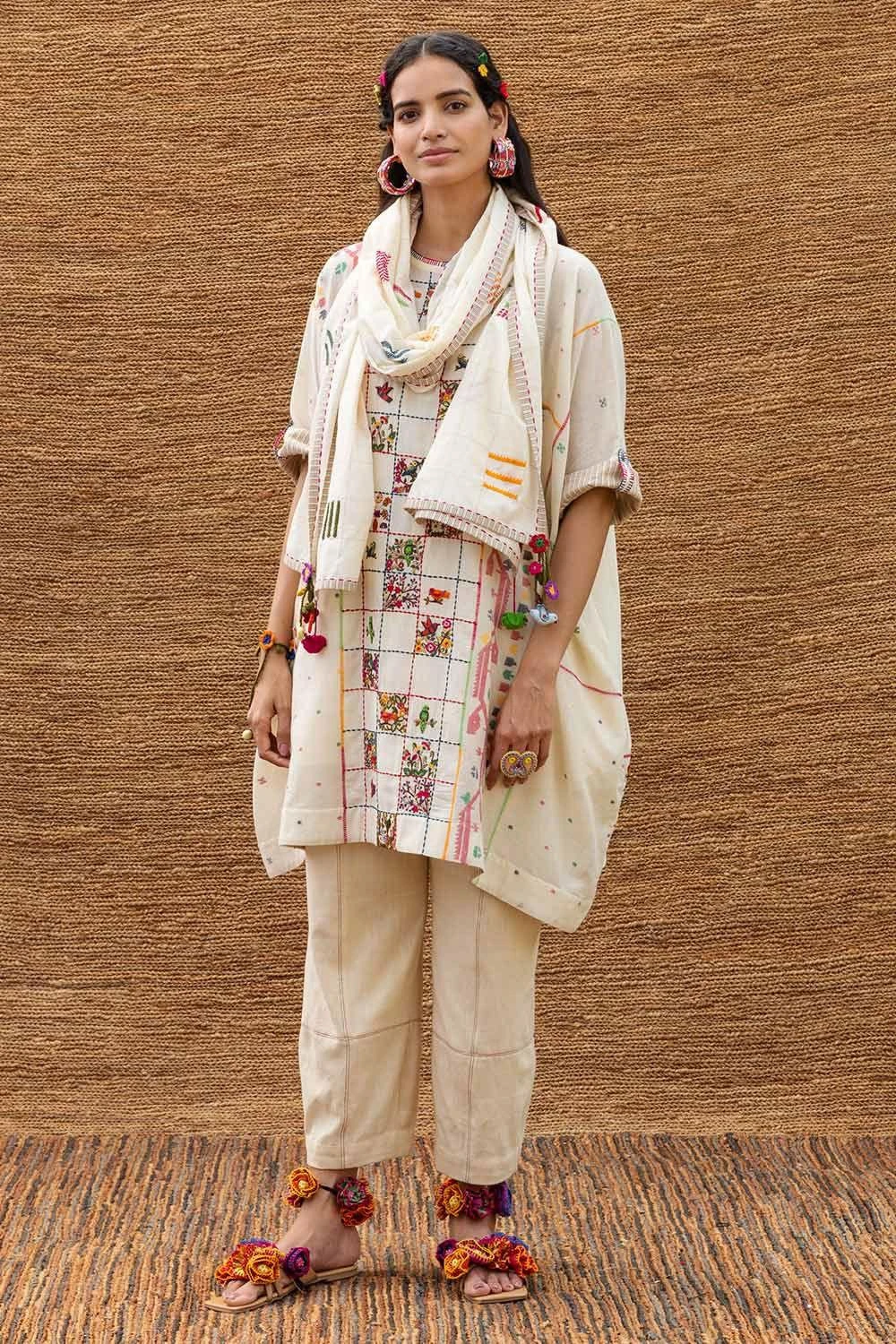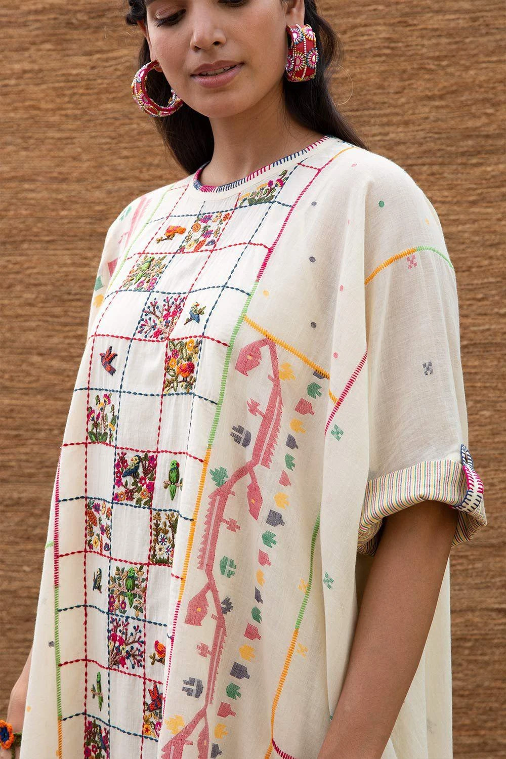 This kimono style easy pull-over dress is made in breathable jamdani muslin textile with single button closure & yoke detail at the back. This easy breezy piece is uplifted with intricate thread embroidery in the center.