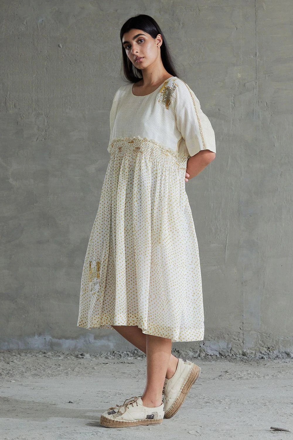 This dress made in handspun cotton comes with kimono-inspired sleeves, back full button-down closure and side seam pockets. It has ruched gathers on the waist and frayed edging. The dress has boro style patchwork and sashiko stitch accents.