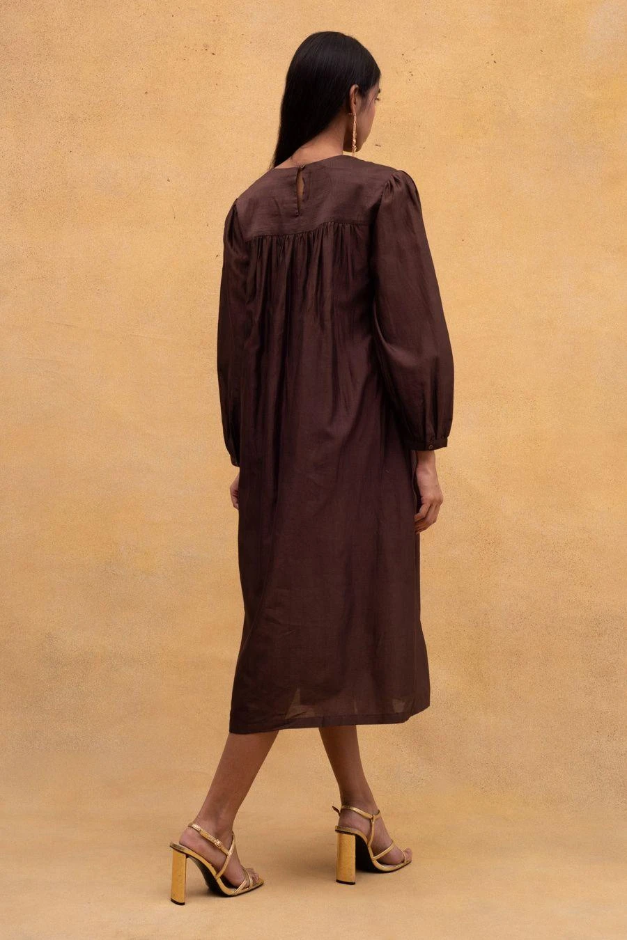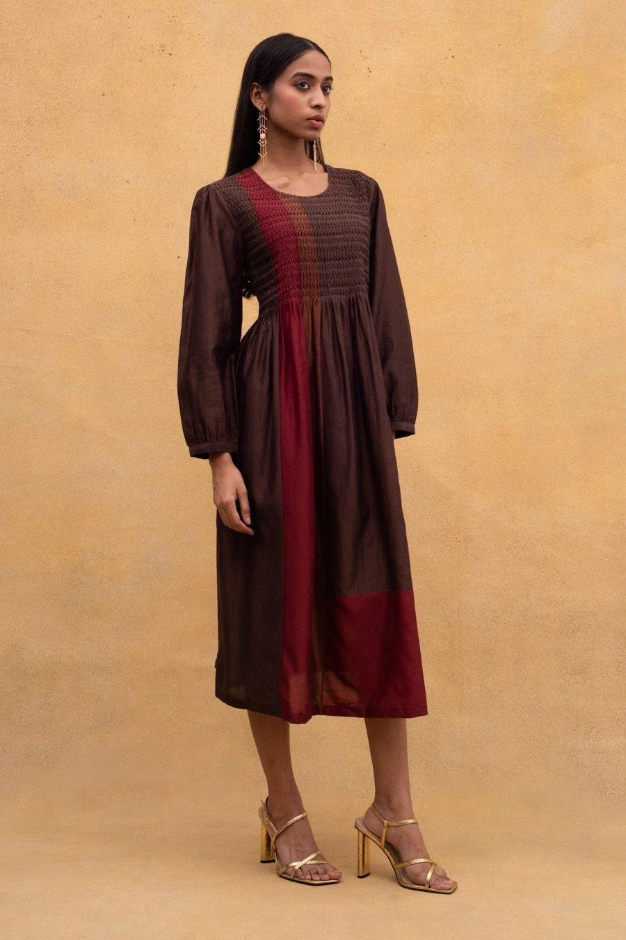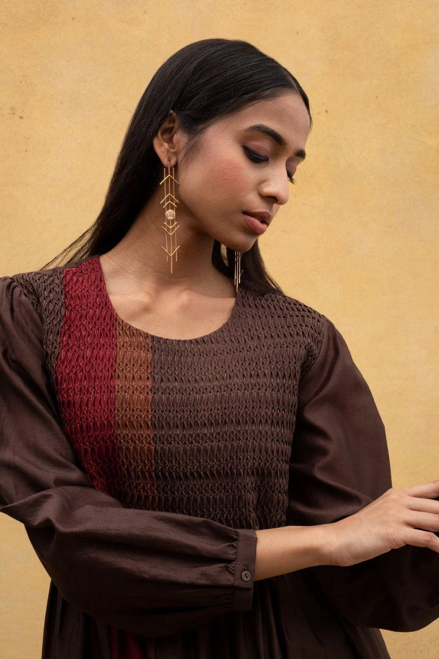 From your work desk to the brunch table & from lounging at home to catching flights, you can always count on this set. Crafted in mulberry silk, this colour block dress features fine shell tuck details, and gathers at the cuff with zari embroidery.