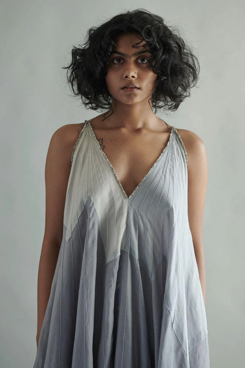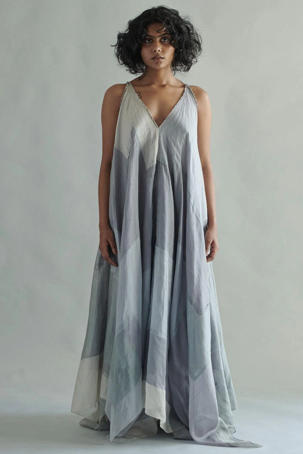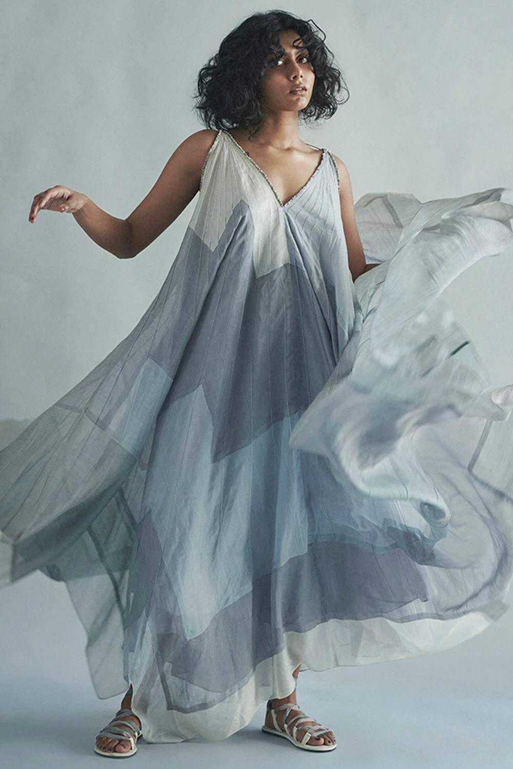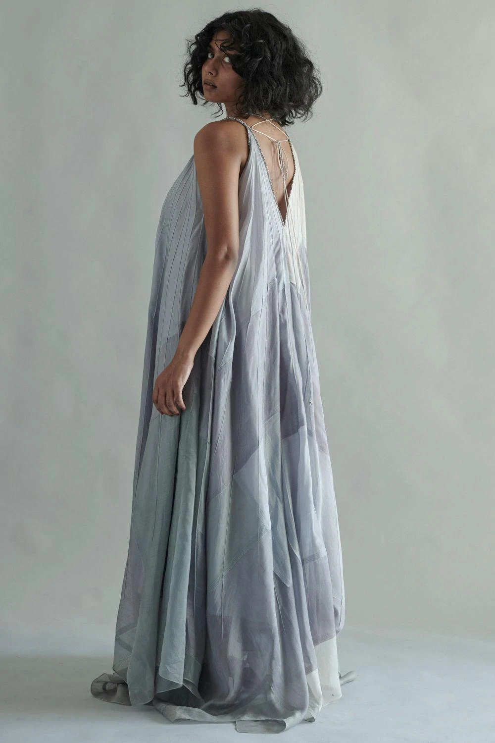 This asymmetrical colour-blocked maxi dress exudes a dreamy summer vibe. The delicate pastel colours & flowy silhouette make it perfect for warm days. It is made in handwoven silk chanderi, lined with cotton voile in a zero waste pattern.