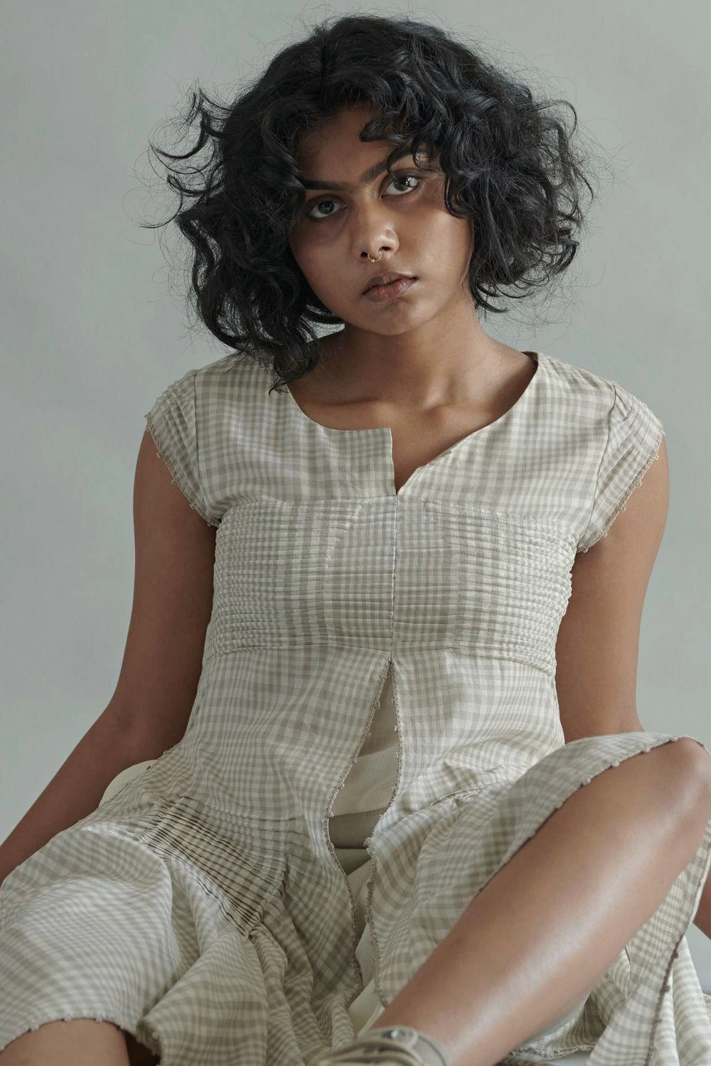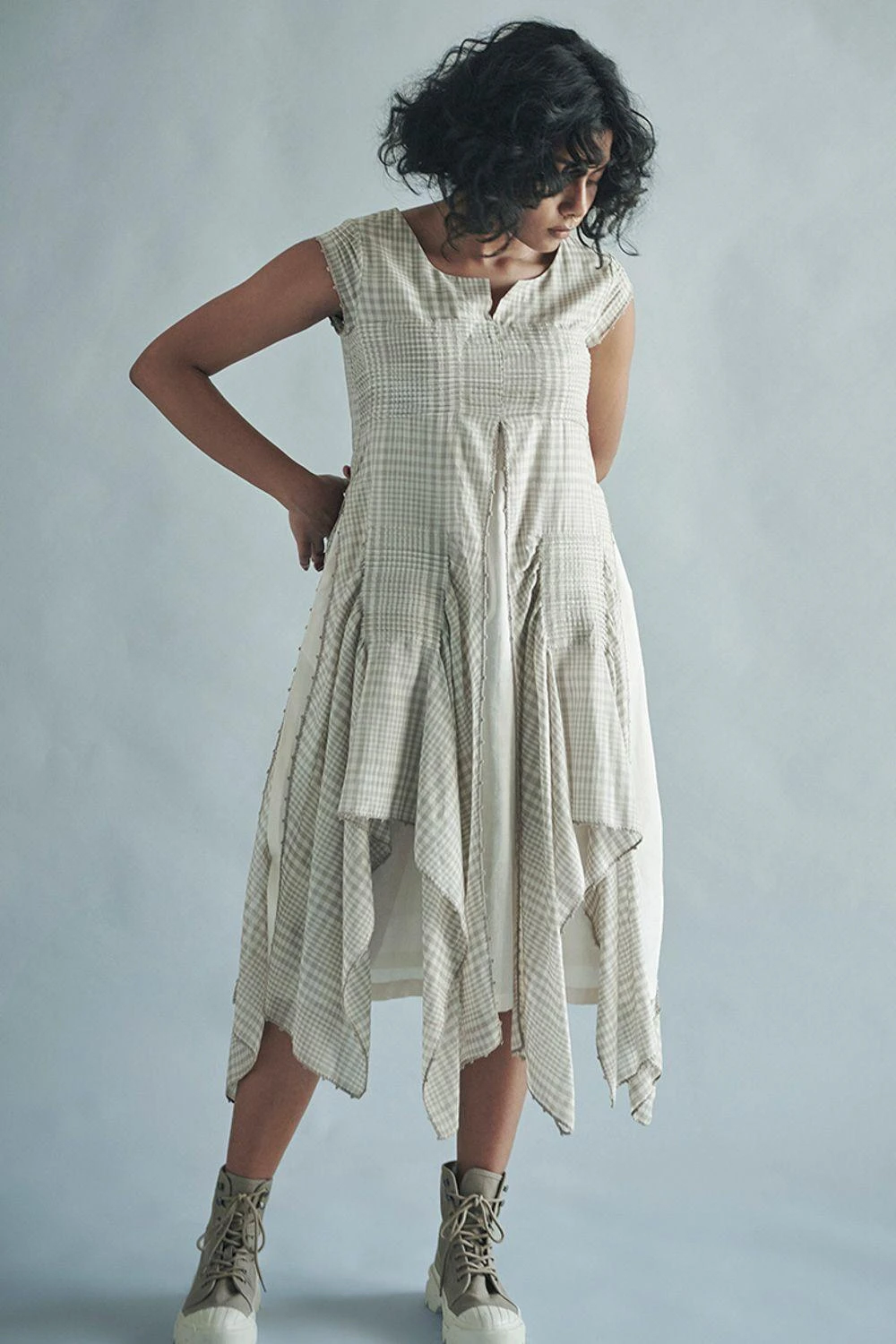 This cascade double layered draped dress is a perfect choice for a quick dressy look. It is cut in yarn dyed handwoven cotton with fine pintucks & delicate hand crochet details. You can style it with a pair of statement earrings & heels.
