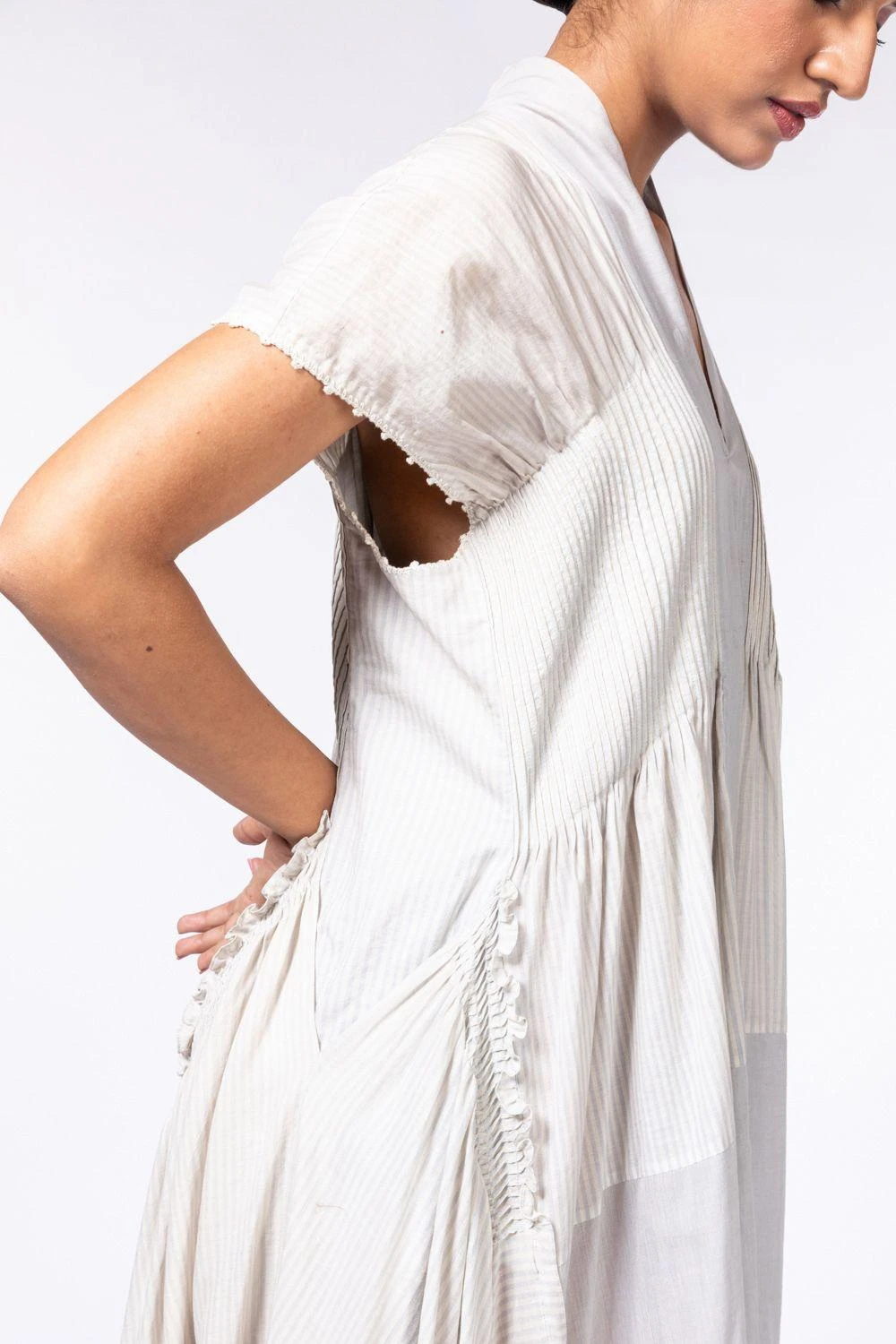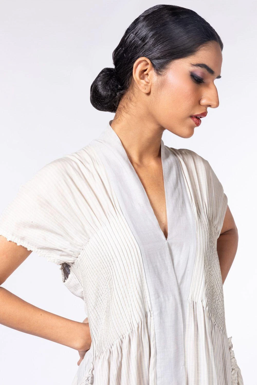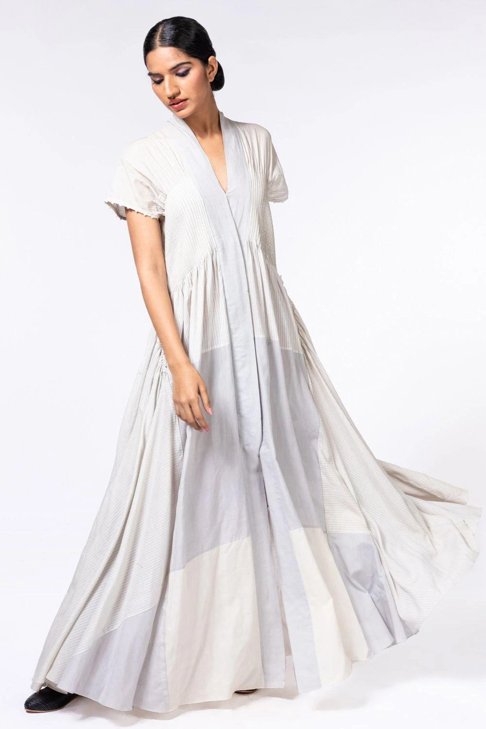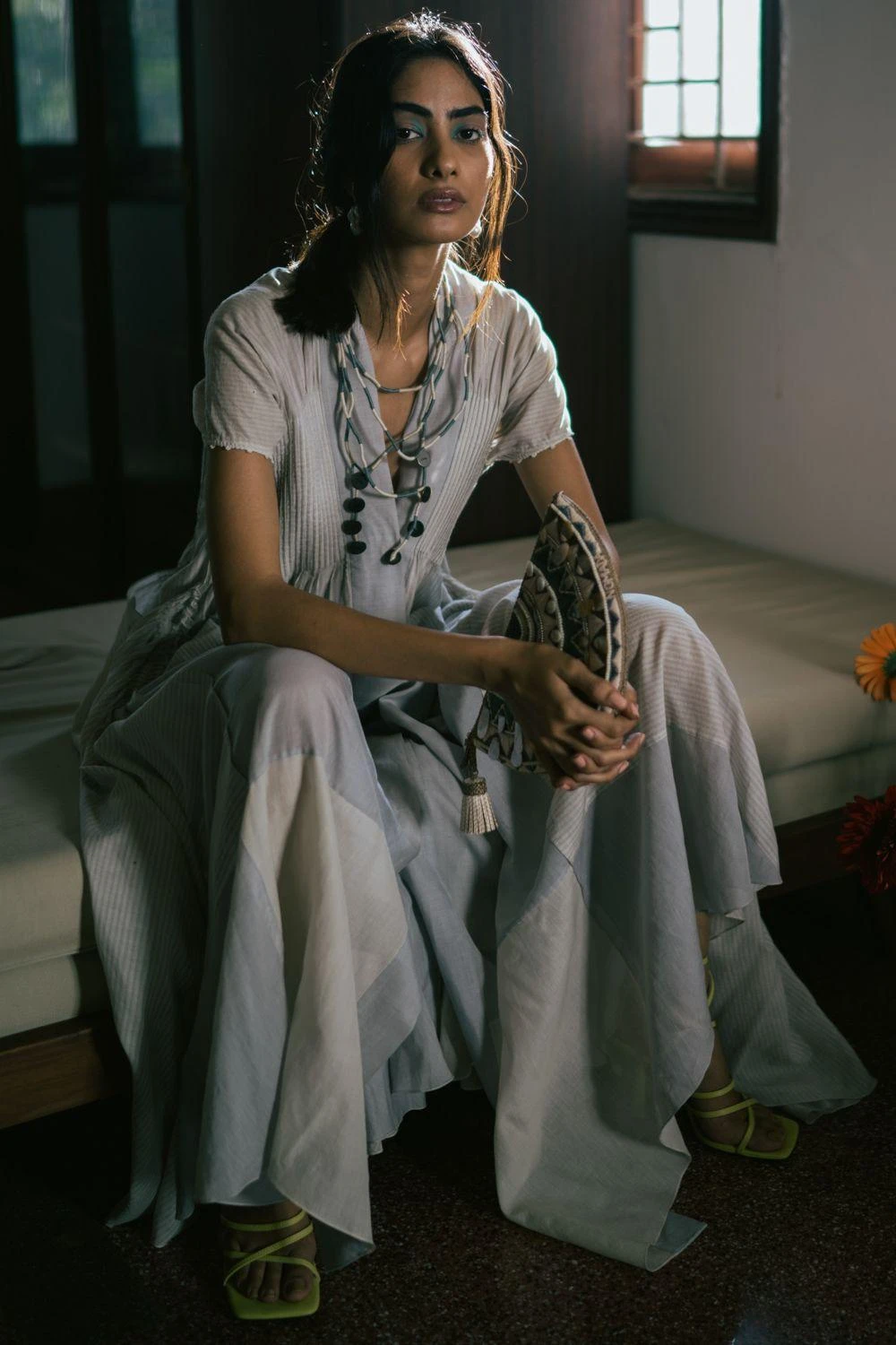 This summery patchwork maxi dress exudes a dreamy vibe. The delicate pastel colours & flowy silhouette make it perfect for warm days. Style this piece with a set of silver bangles & juttis for the daytime.