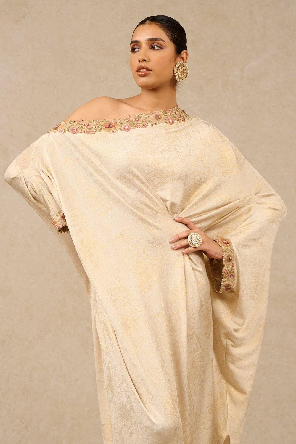 Elevate your style with this asymmetrical off-shoulder dress in shimmering foil-jersey, accentuated by exquisite Gara-embroidered borders gracing the neckline and sleeves. It’s a vision of contemporary glamour.