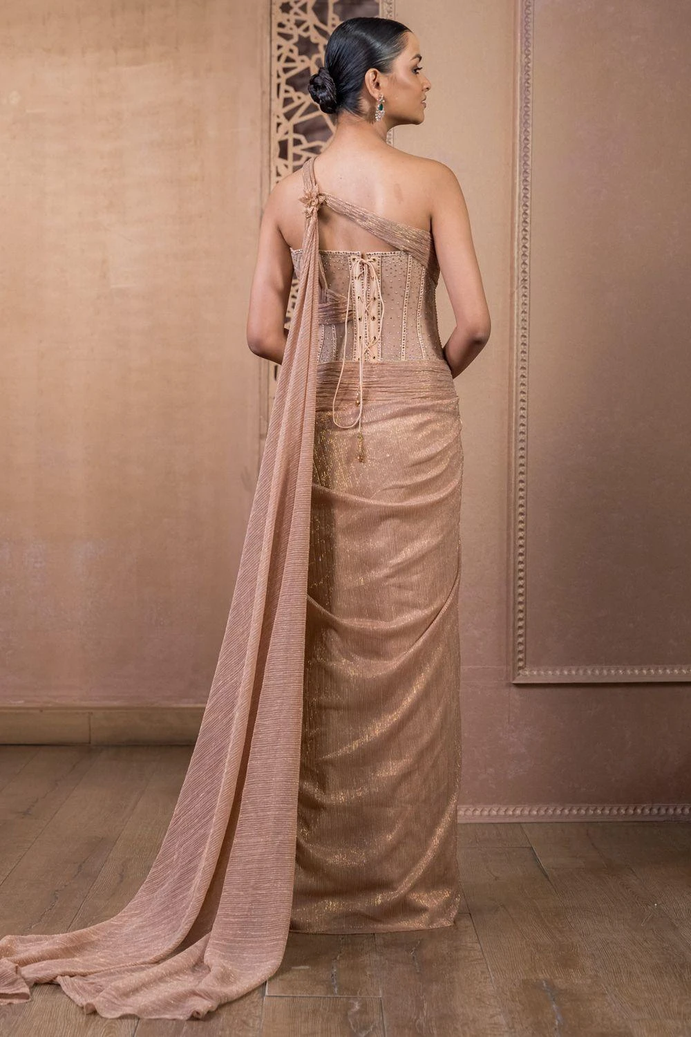 This sculpted draped dress in metallic crinkle tulle with an extended drape in the back is constructed with a sheer midriff which is encrusted with crystals all over. Add a pair of statement earrings to complete the look.