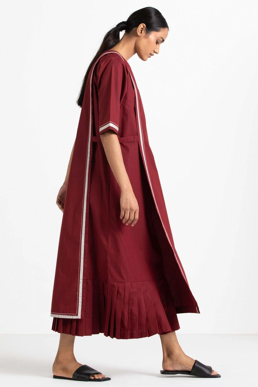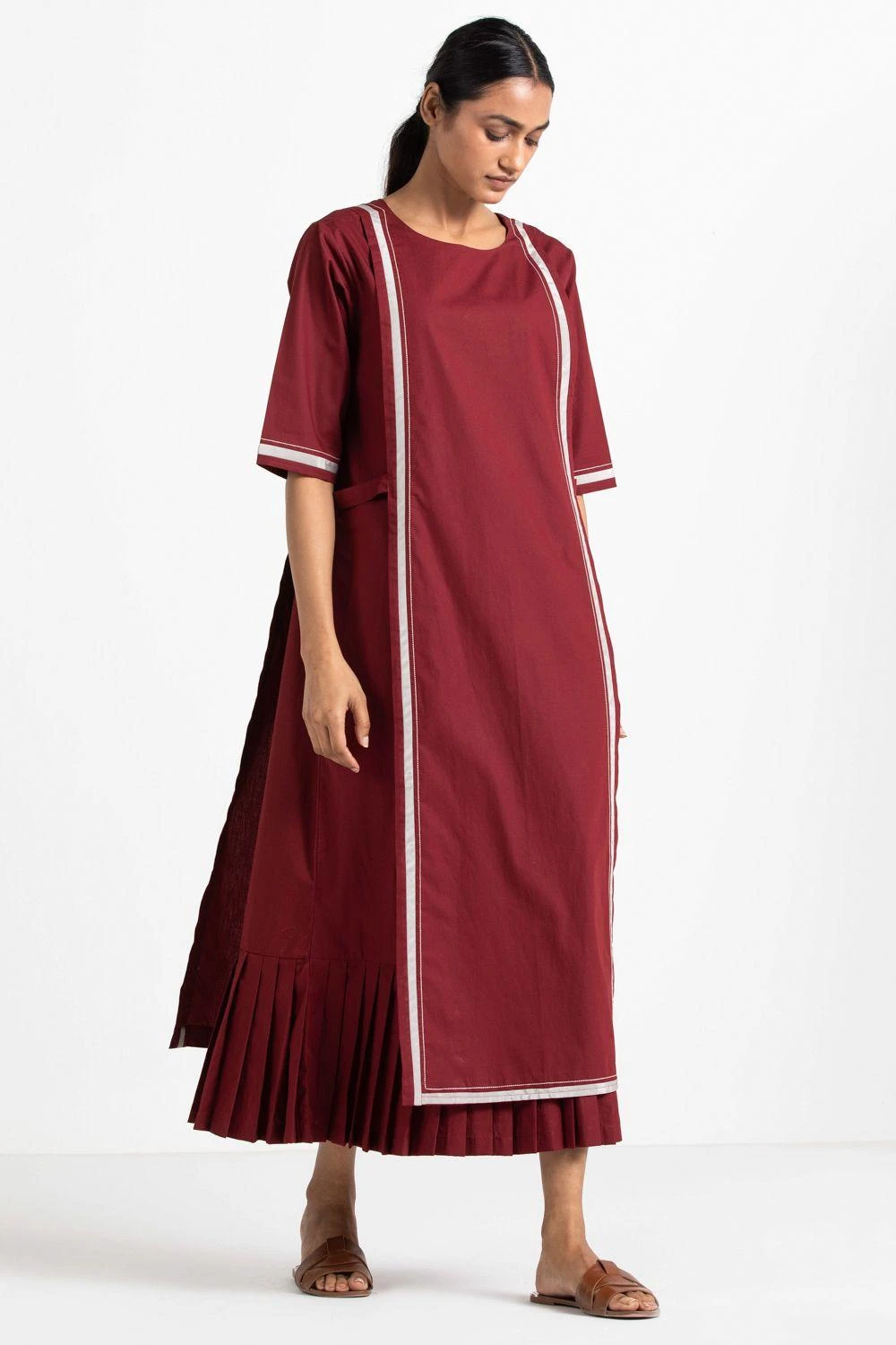This cotton poplin dress is cut in a unique silhouette with front panels and bottom pleats detailing. It is woven in crisp cotton poplin in a relaxed silhouette. You can style it with chic flats and oxidised silver studs for an edgy look.
