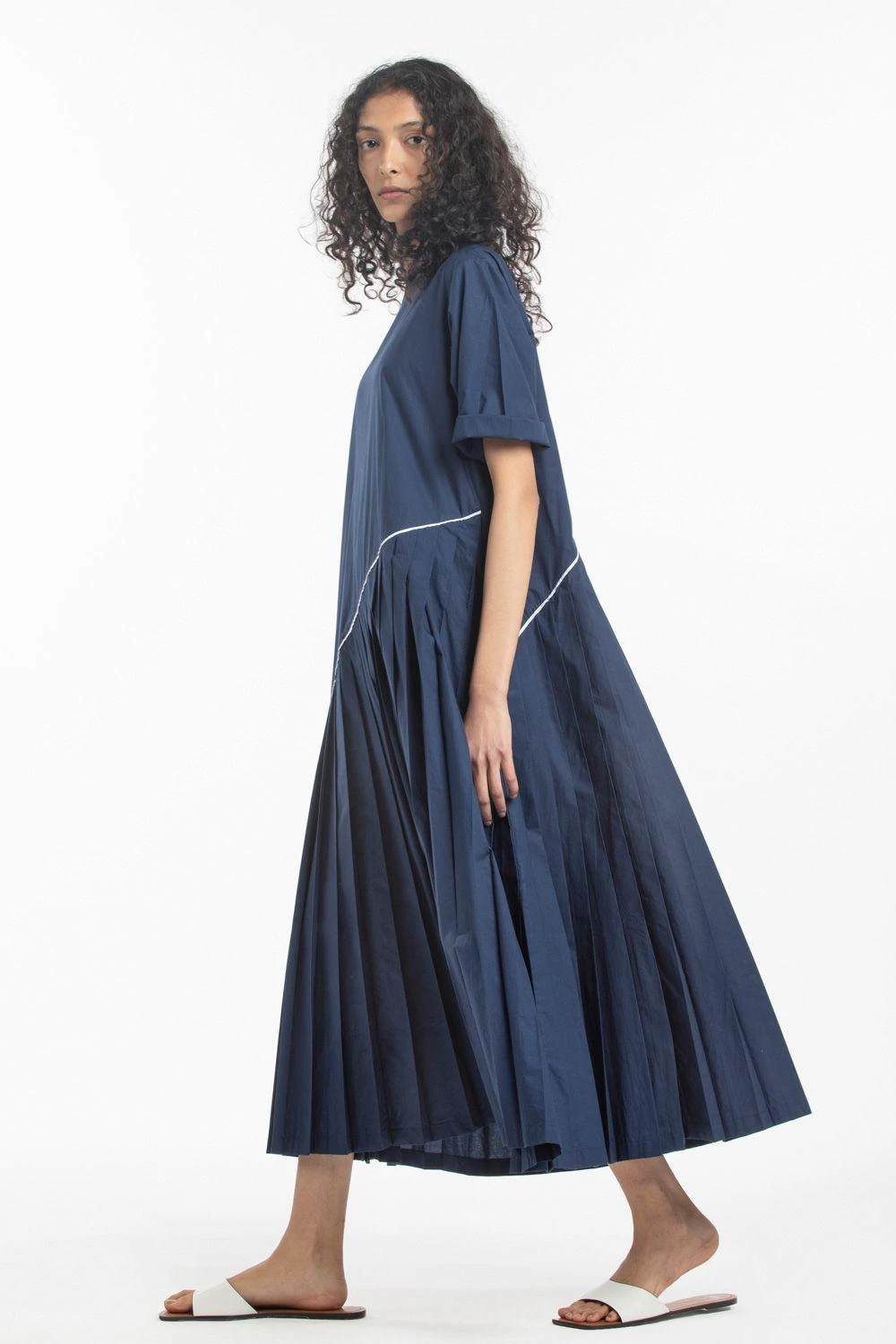This cotton poplin dress is set in a breezy silhouette, featuring front asymmetrical pleats with side inseam pockets. You can style this cool piece with a pair of sneakers and a stack of rings to complete this look.