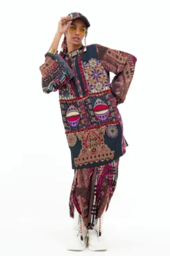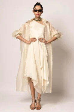 Three’s AW collection is an amalgamation of angular architectural cuts, neutral tines, cut-out backs and a play of stripes. This set features a trench jacket paired with an A-line dress with an Ivory twill tape detail on the back yoke and sleeves.