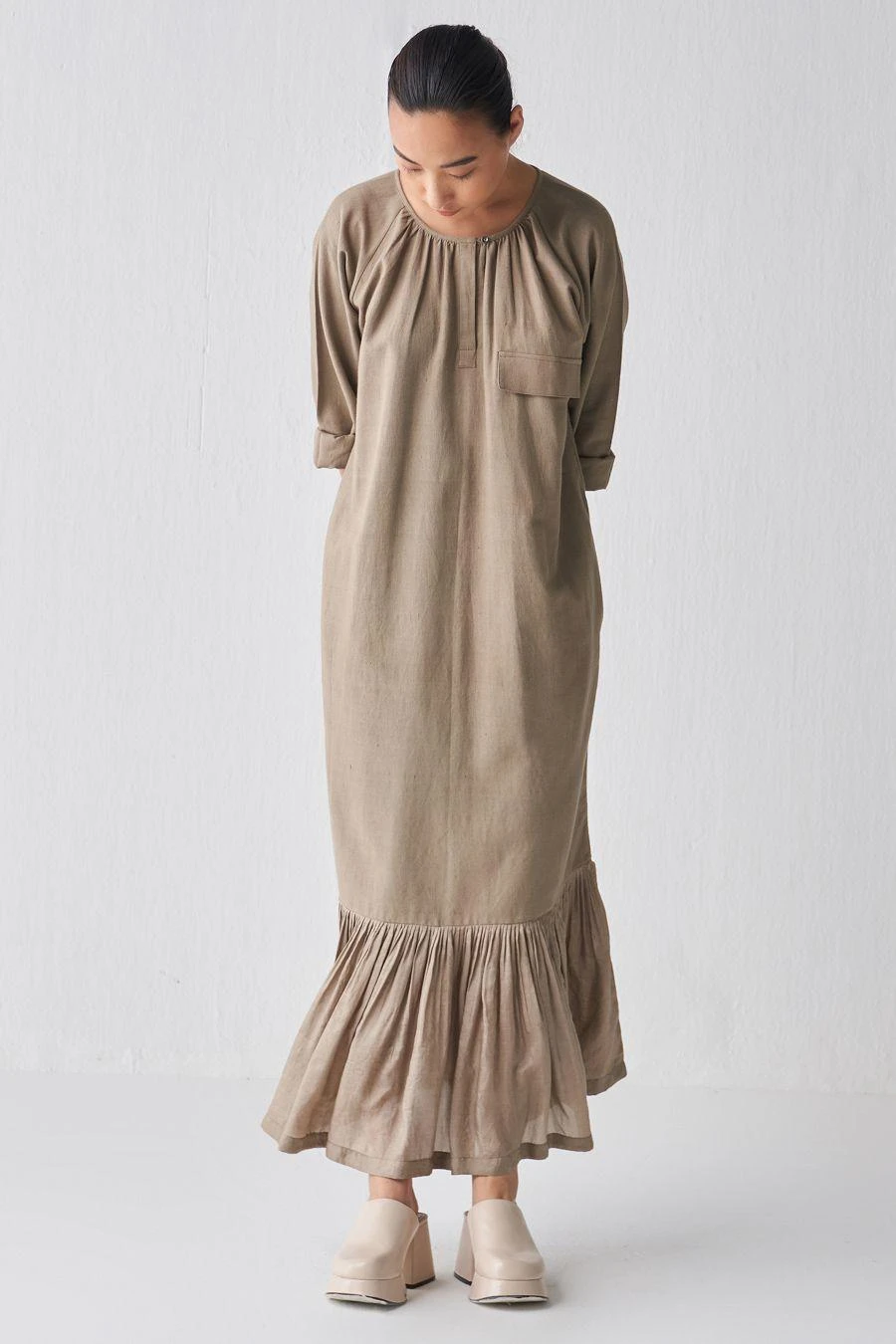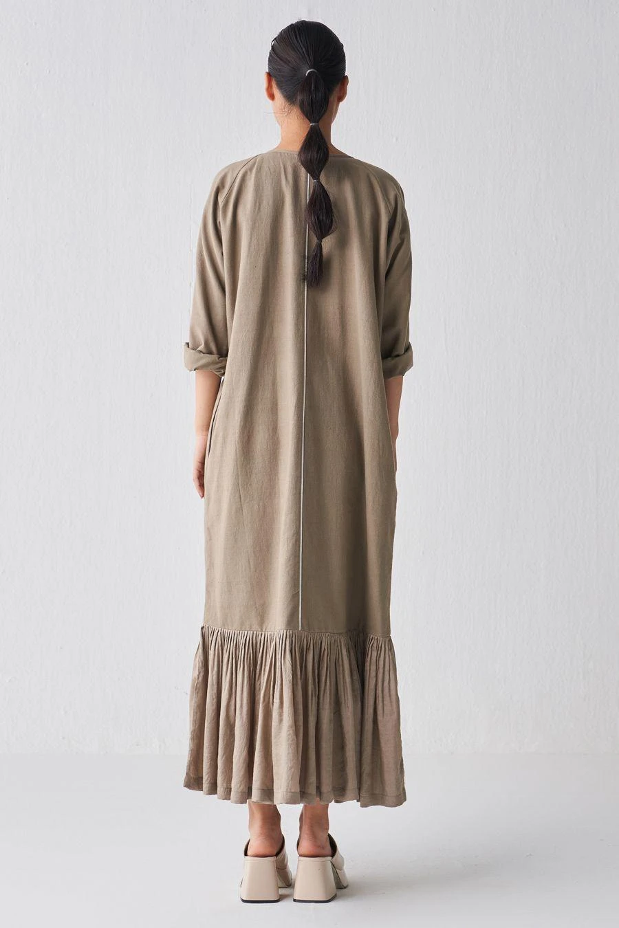 This sage dress falls in the realm of luxe minimalism. Crafted in khadi & silk, this dress features a gathered hem with a frill detail. Add a pair of dangler earrings to complete the look.
