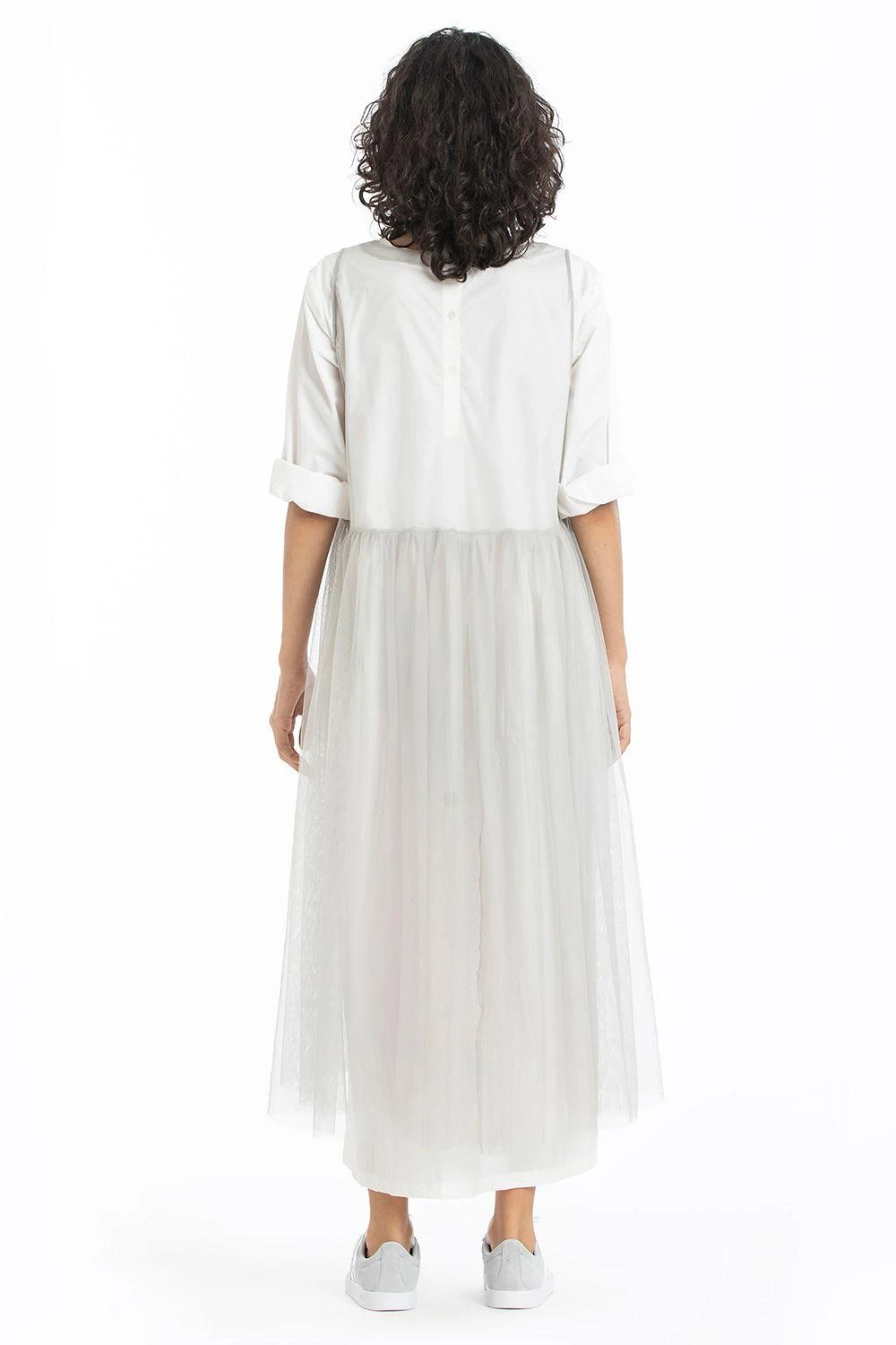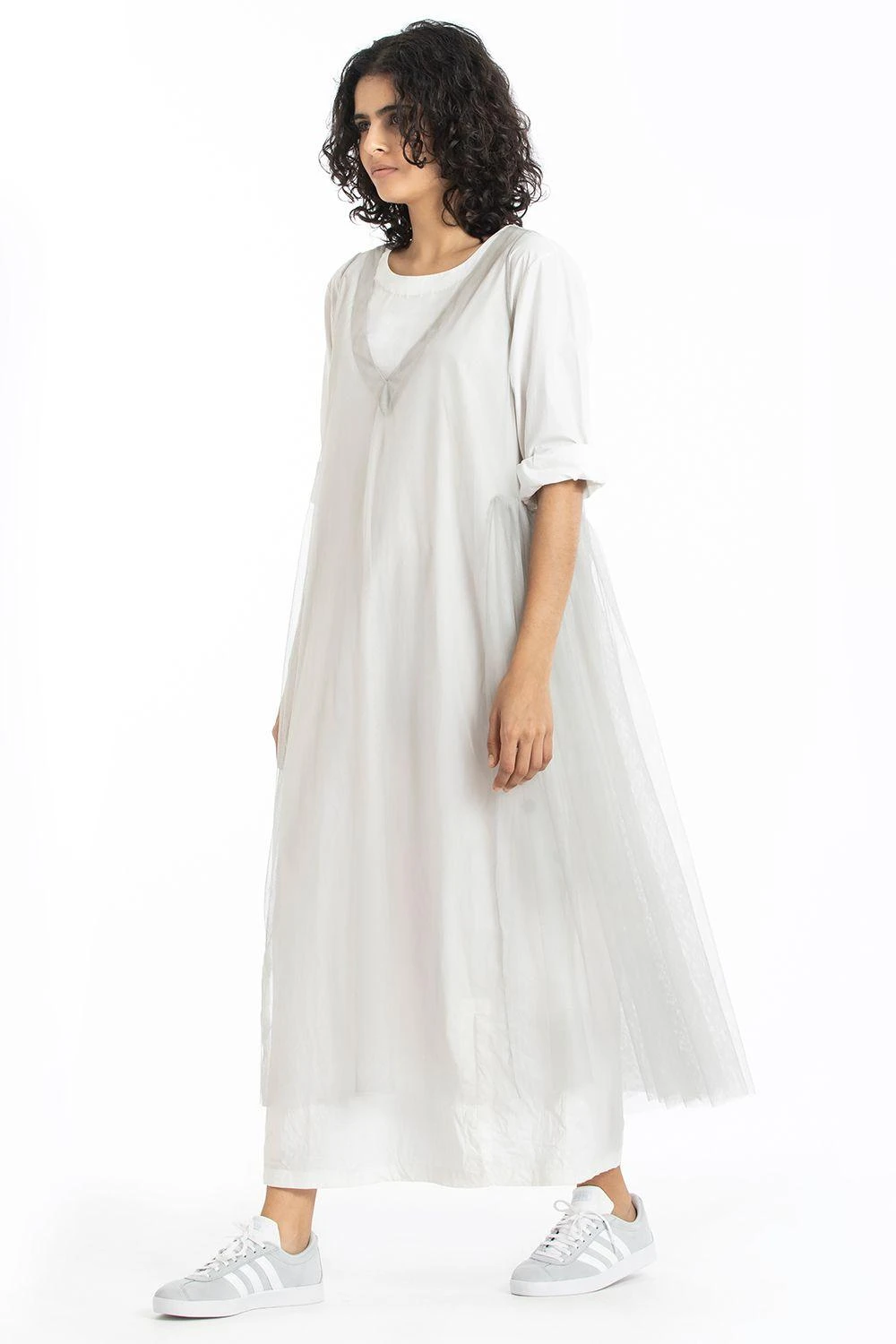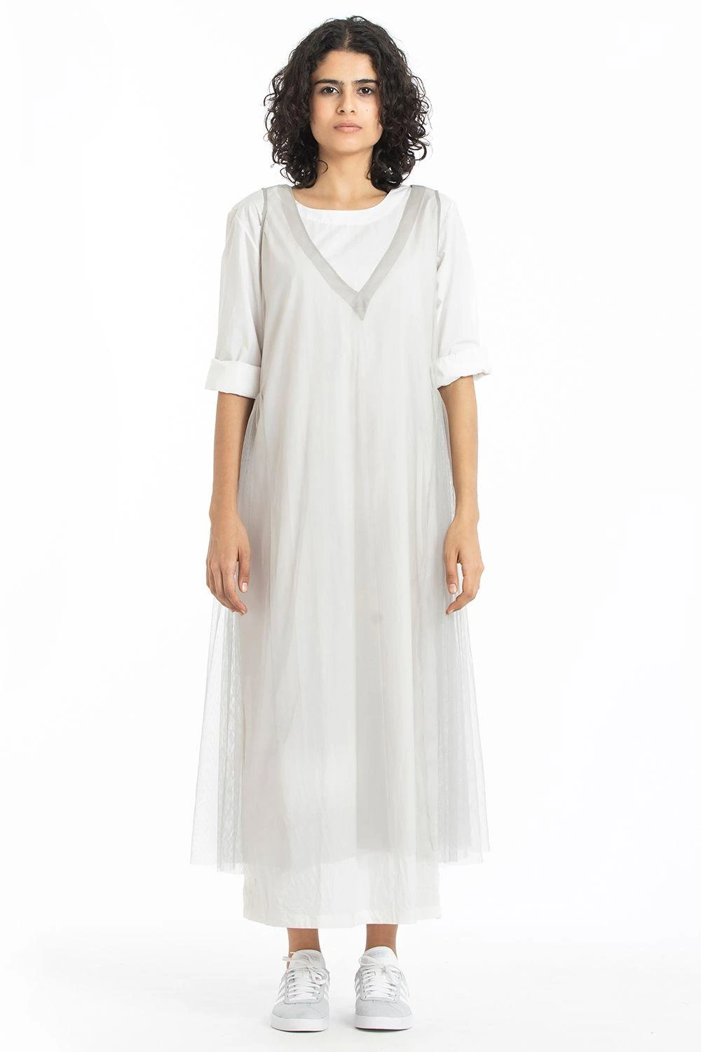 Layering at its best! This soft net side gathered dress worn over a round neck cotton dress is an appropriate choice for a pool side brunch. Pair it with colorful espadrilles to add a resort touch to the look.
