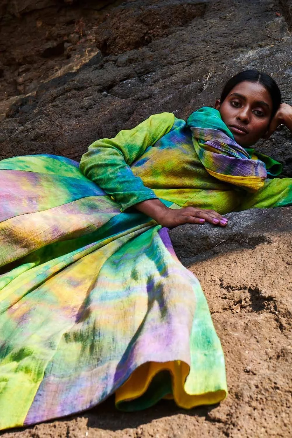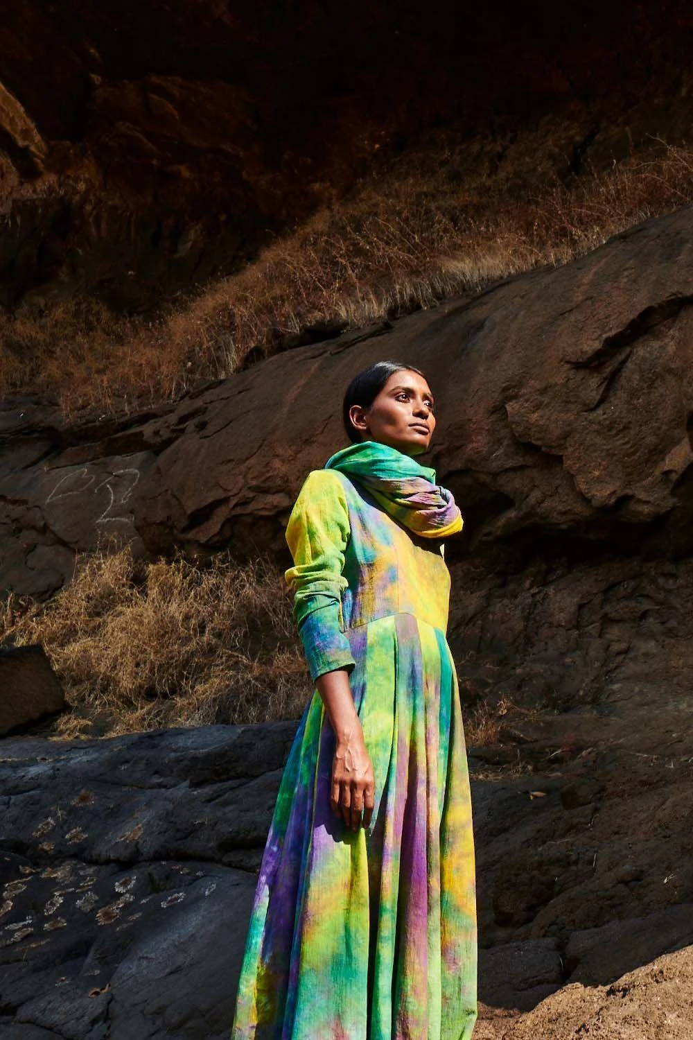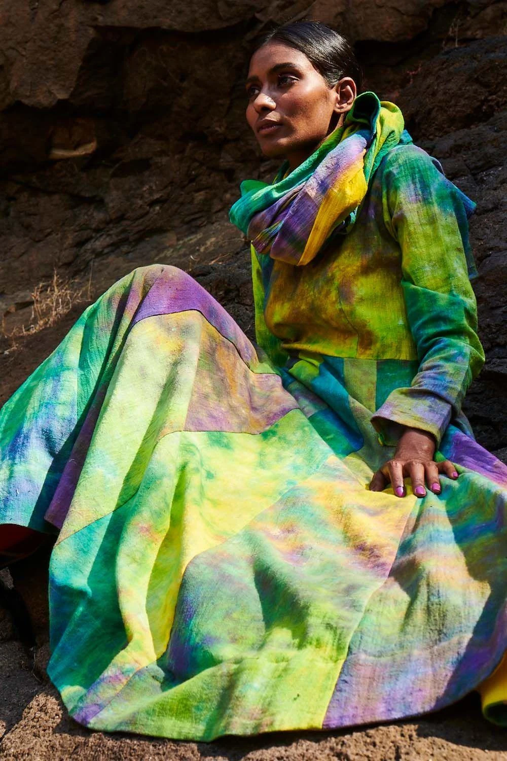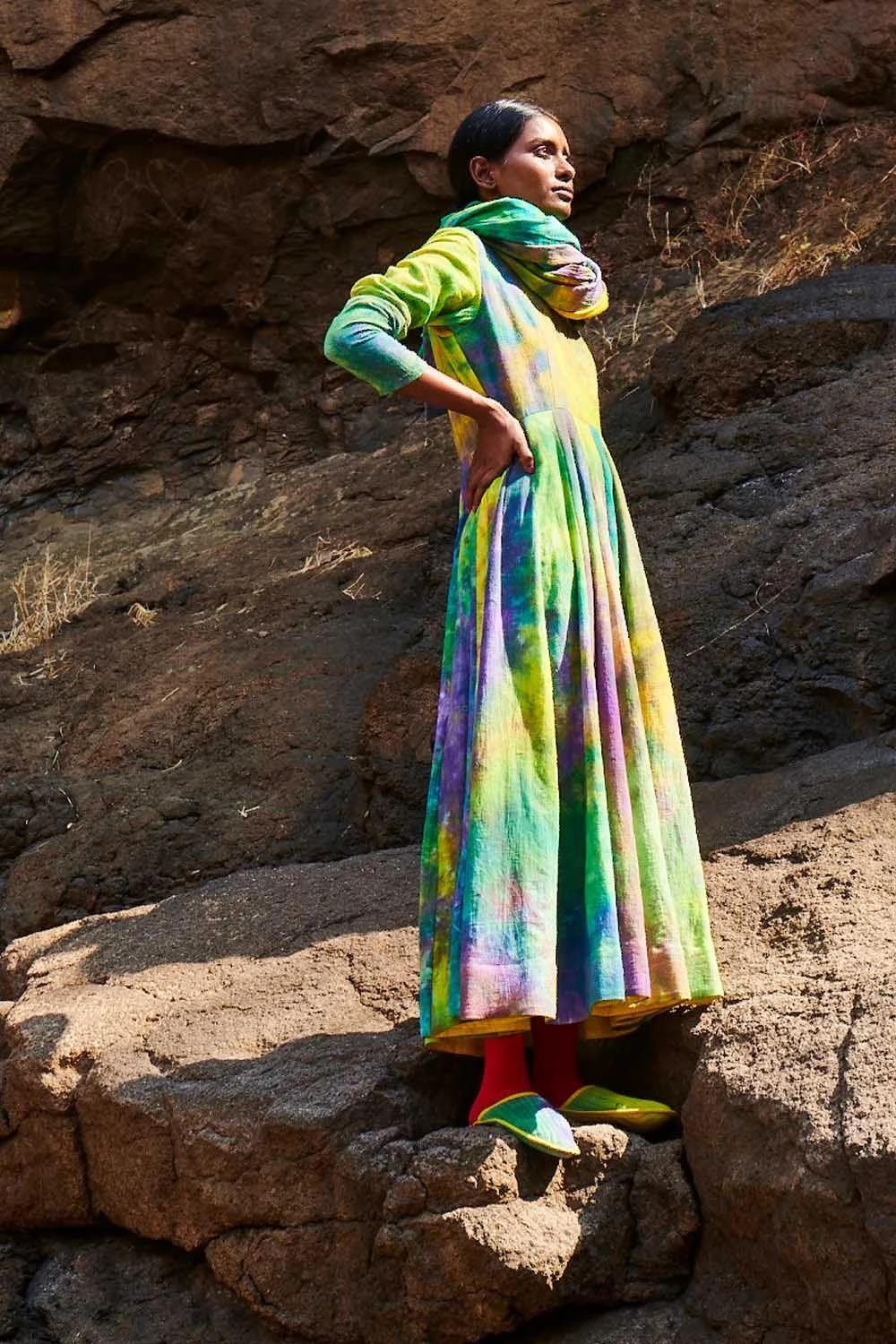 Make a twirl worthy statement in this panelled dress crafted in kala cotton with tie dye technique. This dress features a fitted bodice extended into a flared skirt which beautifully accentuates your form.