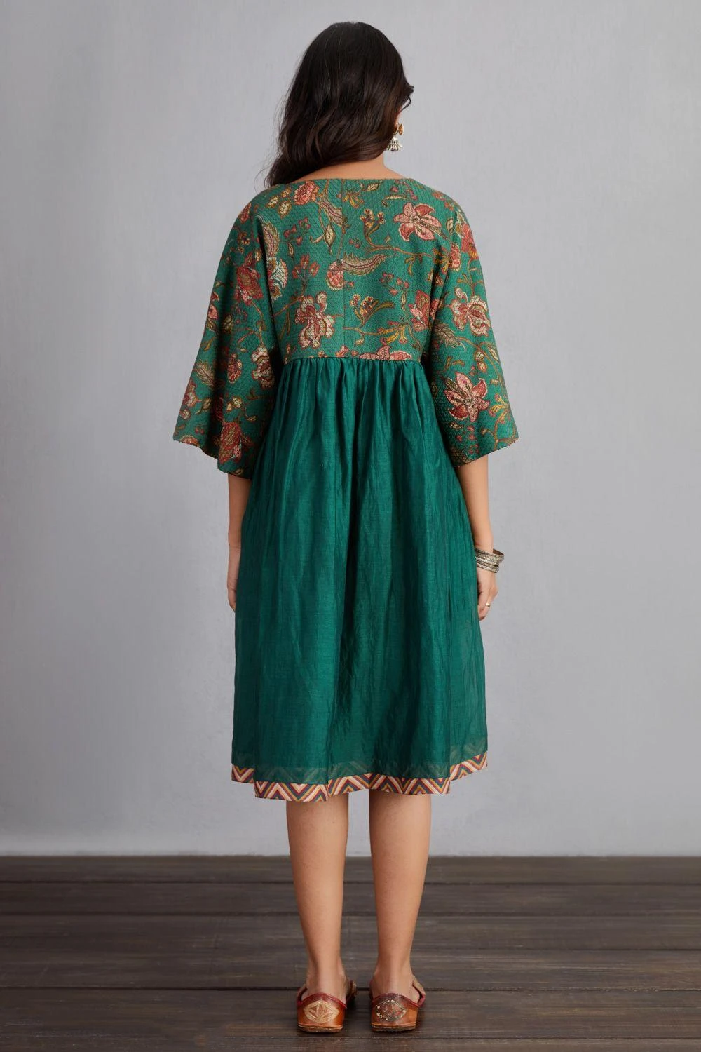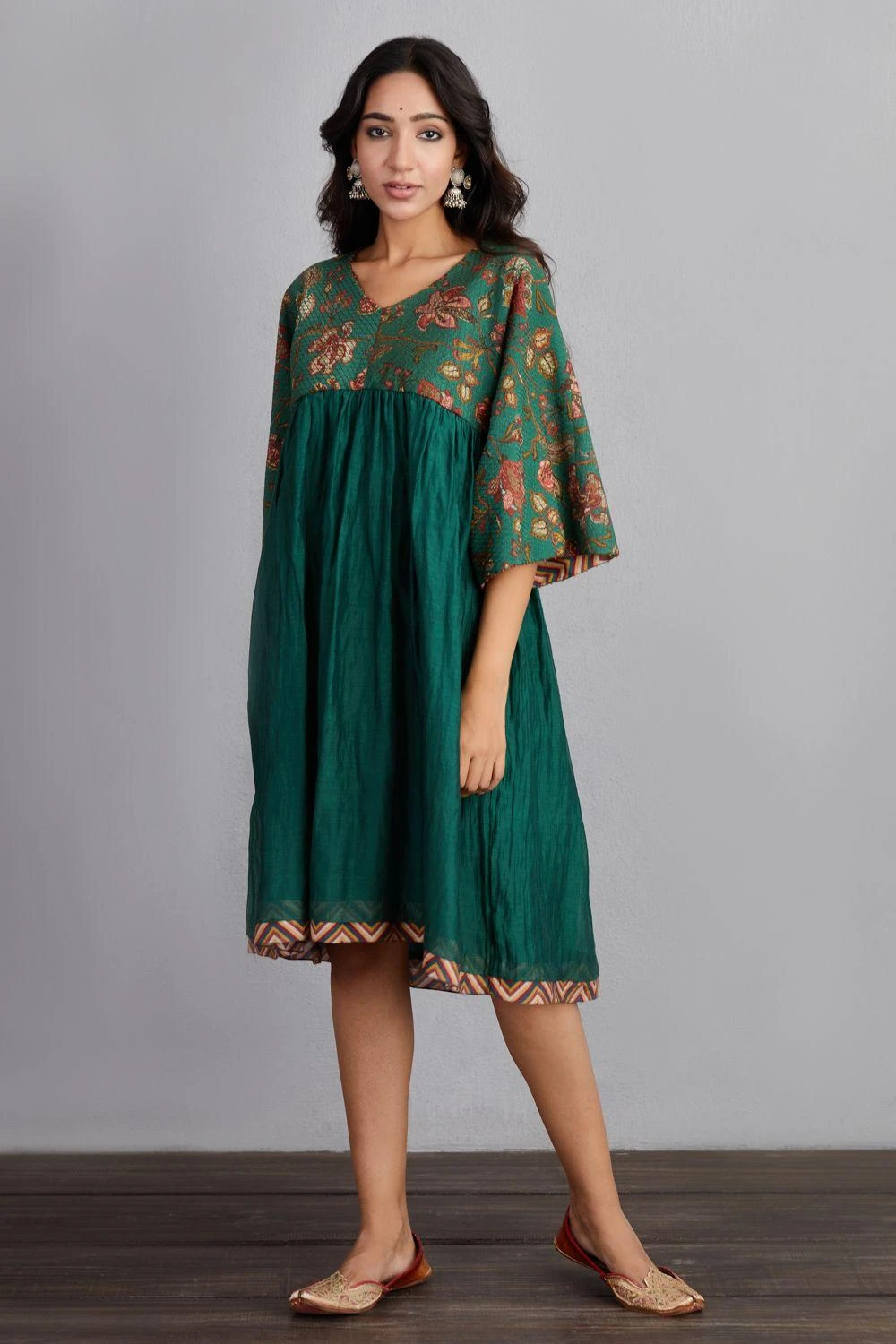 Update your contemporary closet with this tasteful green sheesham lolita dress. It is woven in handwoven chanderi & cotton silk and features gathering details down the yoke. You can dress it up with a pair of silver jhumkas.