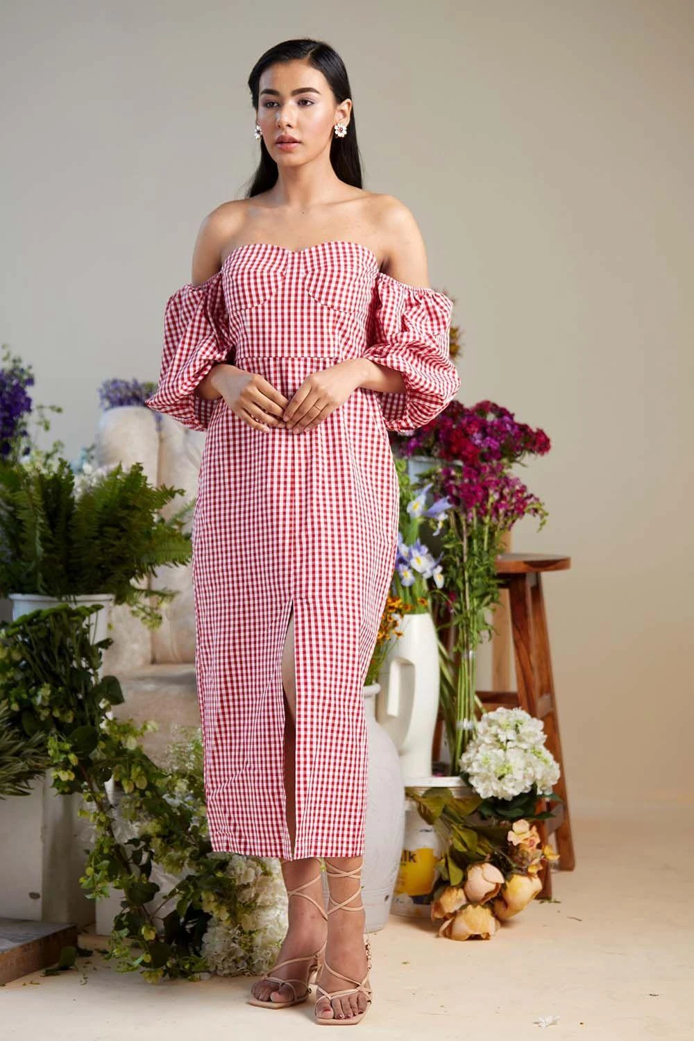This chic gingham midi dress is perfect for the summertime. This fitted dress is perfect for dressy daytime events. Wear it in an off shoulder style and pair it with a clutch & heels to complete the look.
