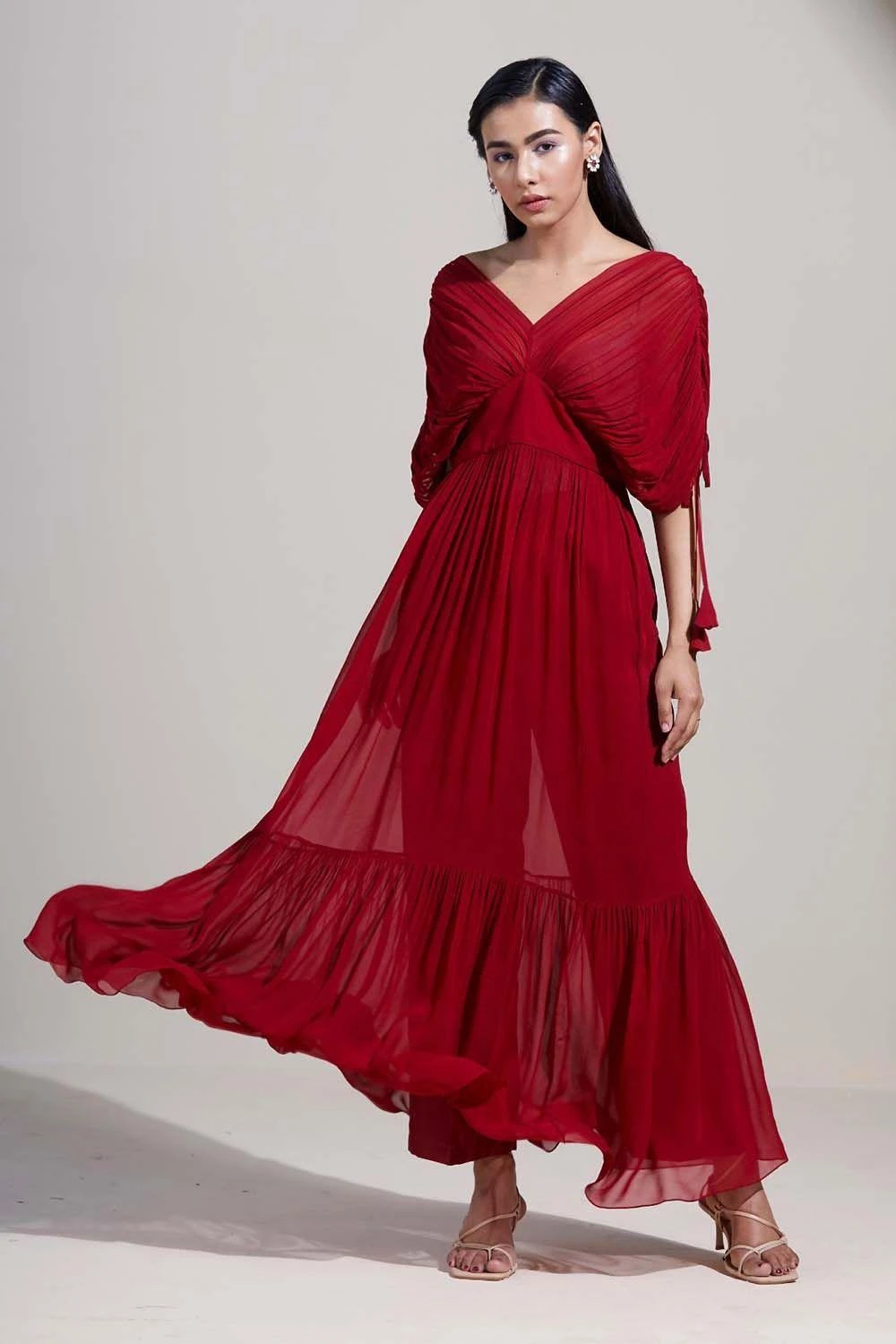 This maroon ruched maxi dress is perfect for the summer. This flowy dress can be paired with gold earrings & a handbag to complete the look. This piece is the perfect addition to your vacation wardrobe.