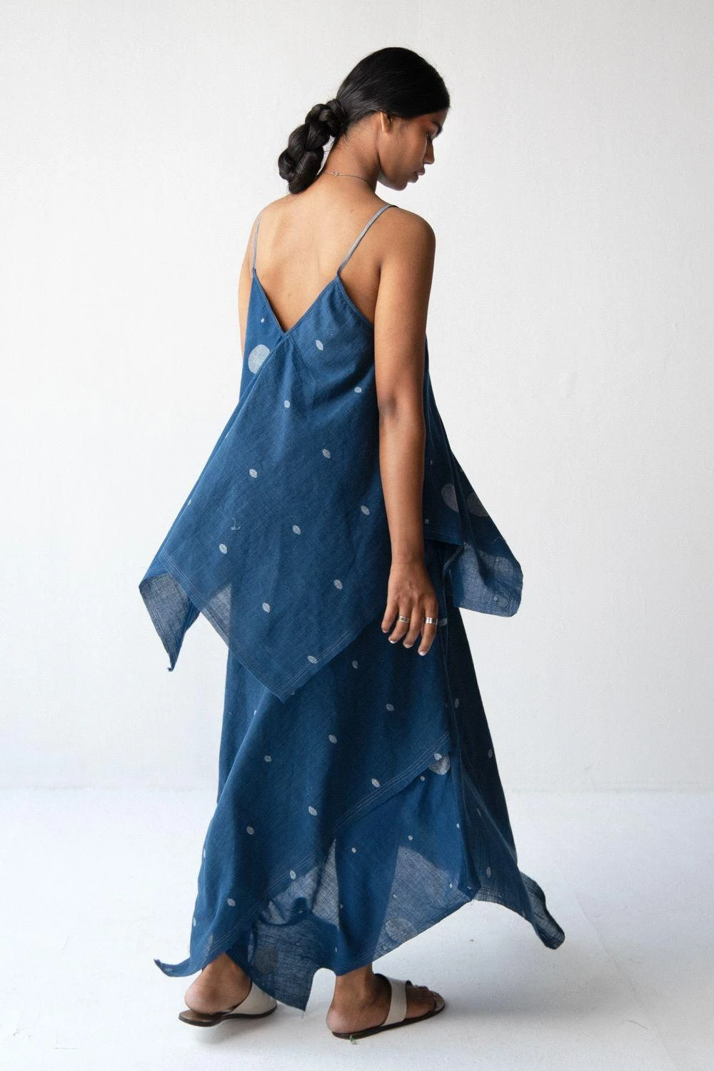 Spruce up your closet with this flirty & feminine slip dress. It is woven in dotted cotton jamdani in a bias layered cut. Style this piece with layered necklaces and a chic bag to accentuate this chic look.