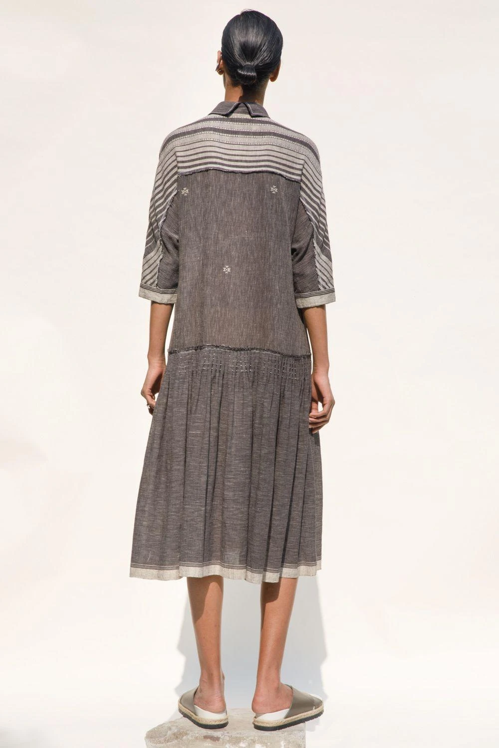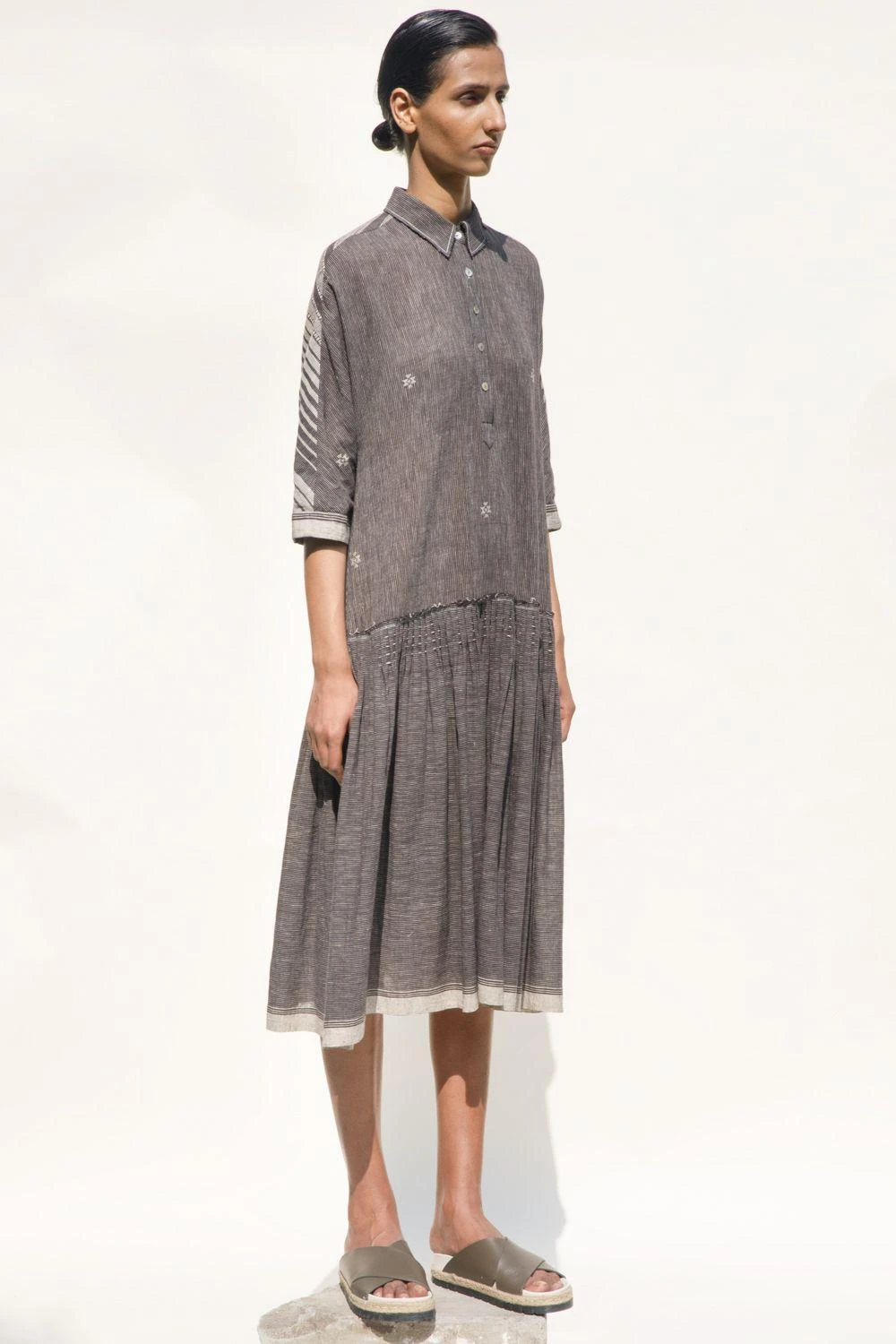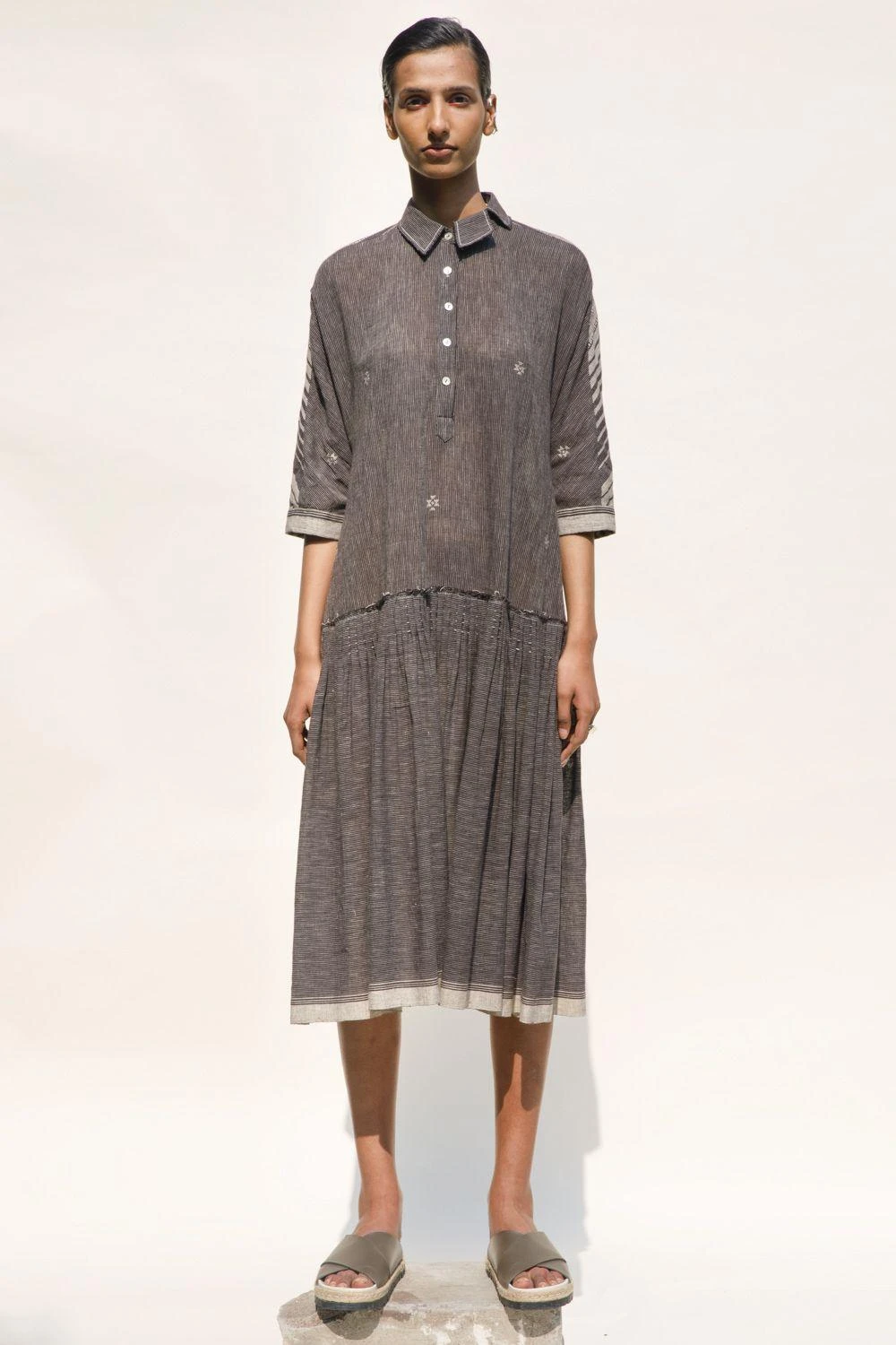 Embark on a journey of elegance with this low waist, collared shirt dress, adorned with flares and crafted from hand-spun cotton jamdani. This enchanting piece stands out on its own but can be elevated further by layering it with a jacket.