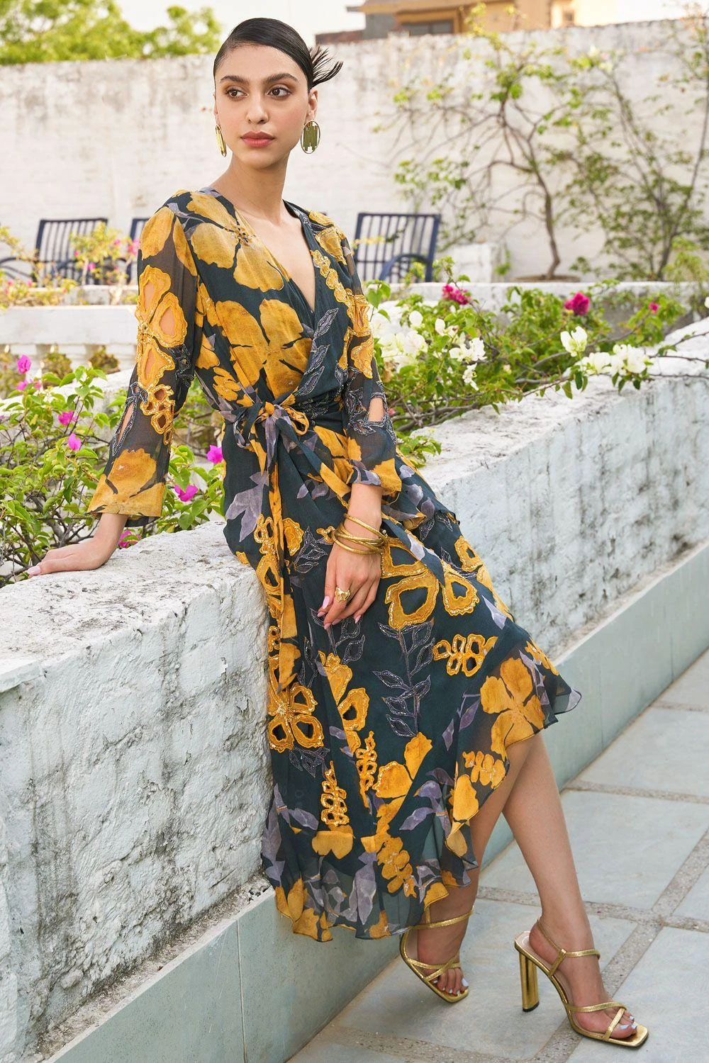 The perfect amalgamation of style & comfort, this wrap dress in a delicate floral print is perfect for a day out. Crafted in georgette, this dress is highlighted with intricate cutwork detail and sequin embroidery.