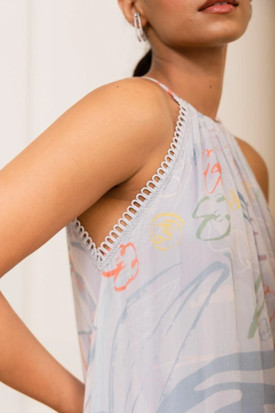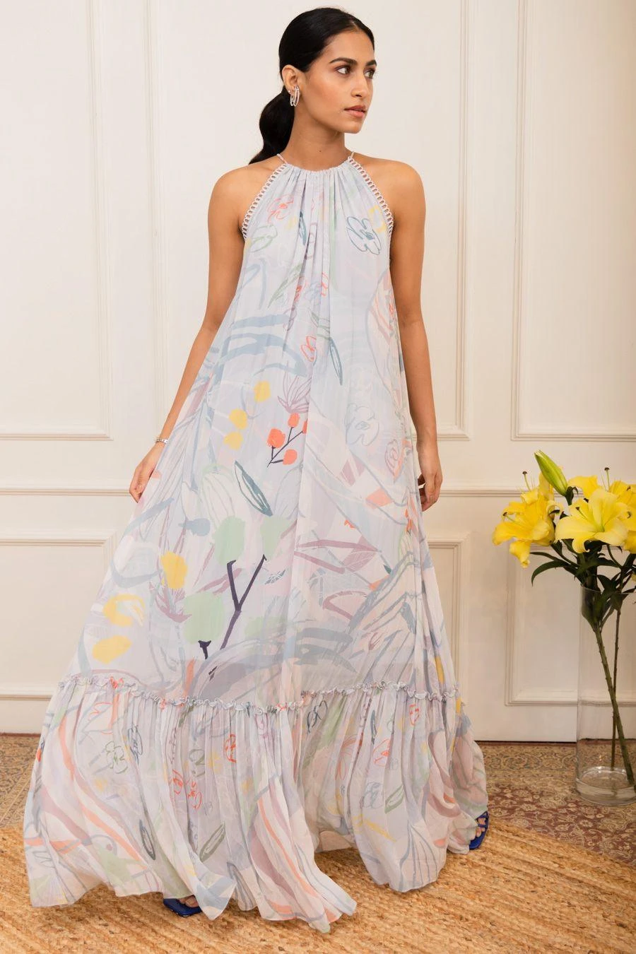 Add a layer of style & glamour to your resort getaways with this maxi dress. Crafted in georgette, this tiered dress features an amoeba print with a halter neck. Style this dress with a pair of dangler earrings & a clutch for a sundowner.