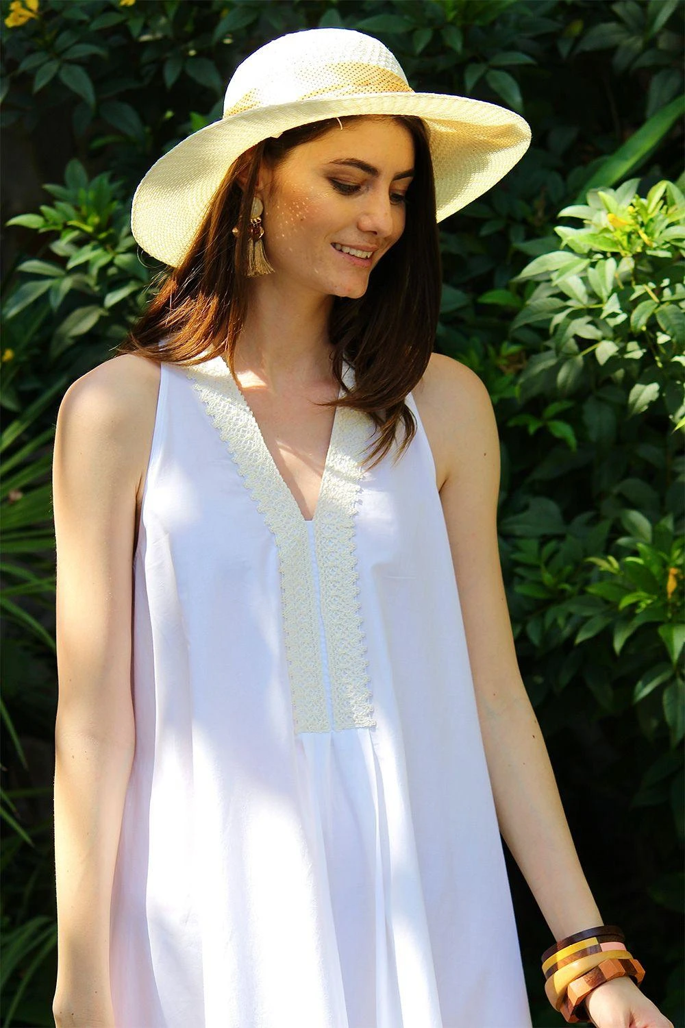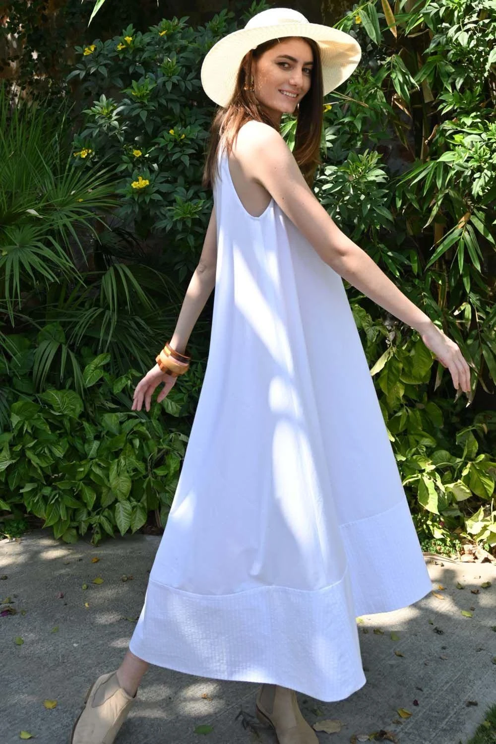 This midi white dress is a classic staple piece you need in your closet. It offers sheer comfort, style and versatility. You can style it with golden bold hoops and wedges to complete your look.