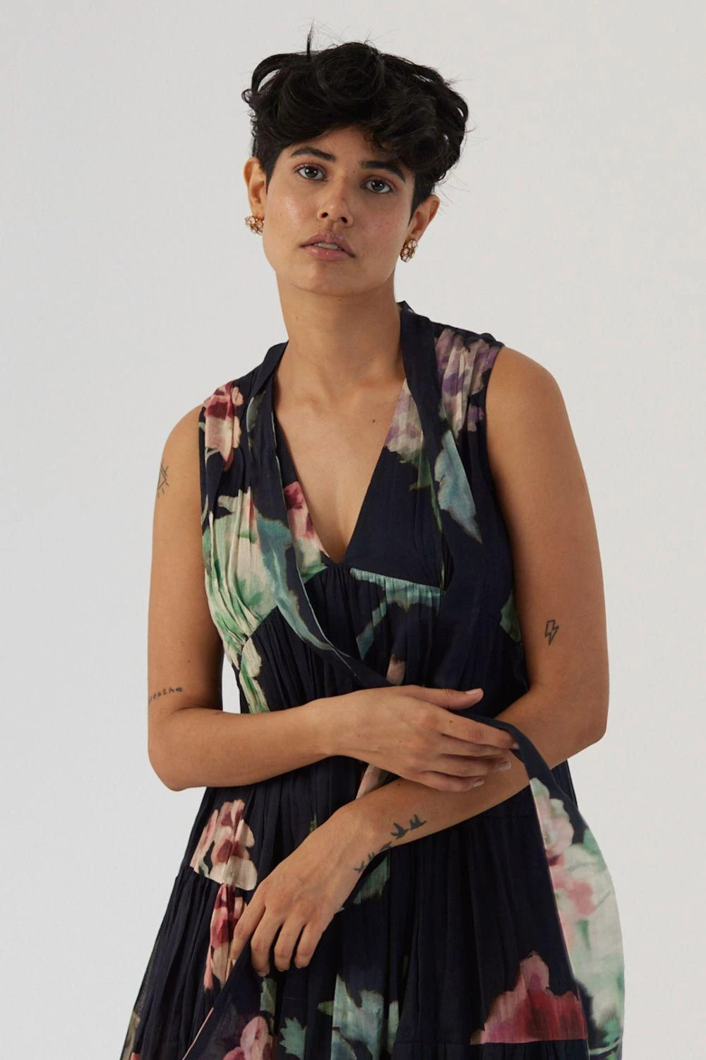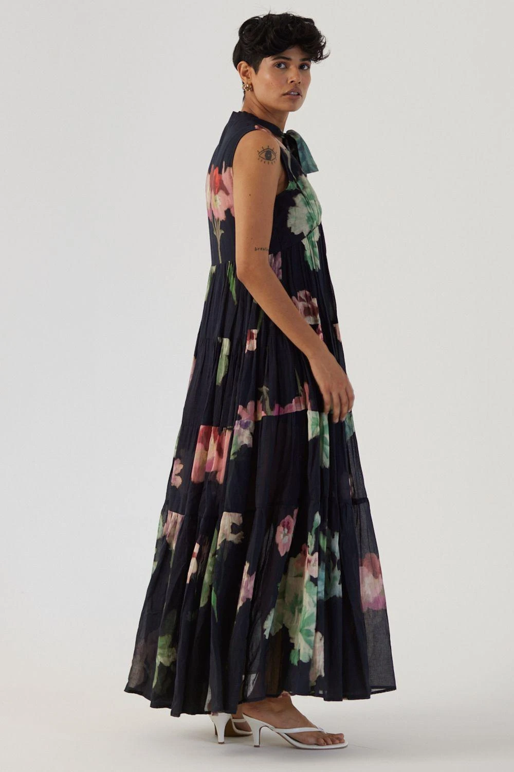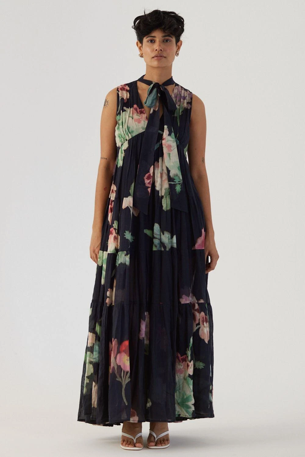 Immerse yourself in the captivating allure of this print, where hand-drawn botanical motifs gracefully bloom against a captivating black base. Crafted in mulmul, this dress exudes sophistication.